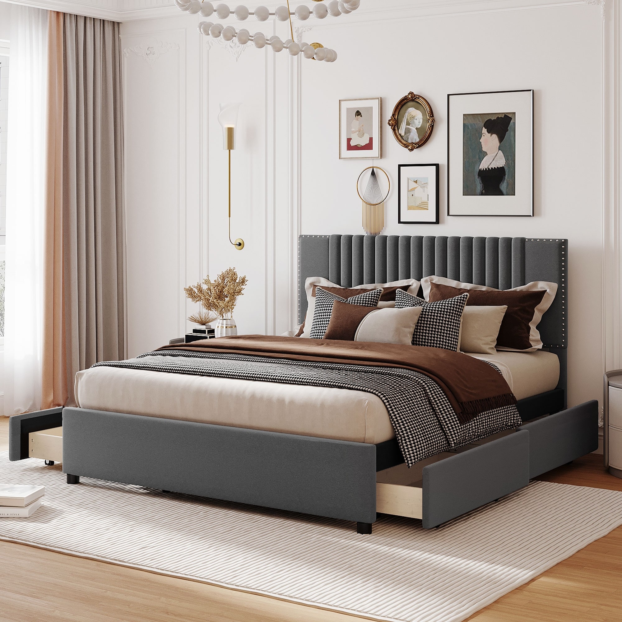 Queen Size Velvet Upholstered Platform Bed with 4 Drawers, Nailhead Trim Headboard and Footboard
