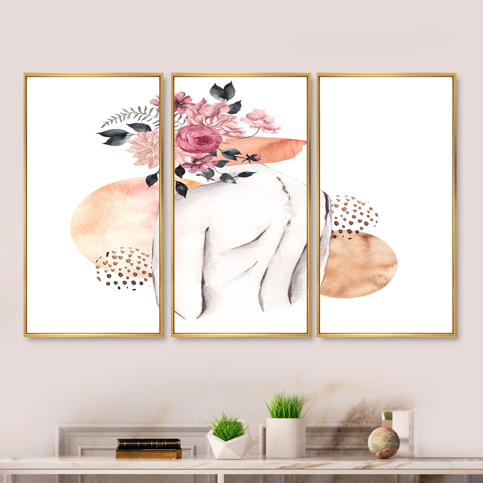 Designart "Woman Silhouette With Red And Purple Flowers II" Glam Framed Canvas Wall Art Print Set of 3 - 4 Colors of Frames