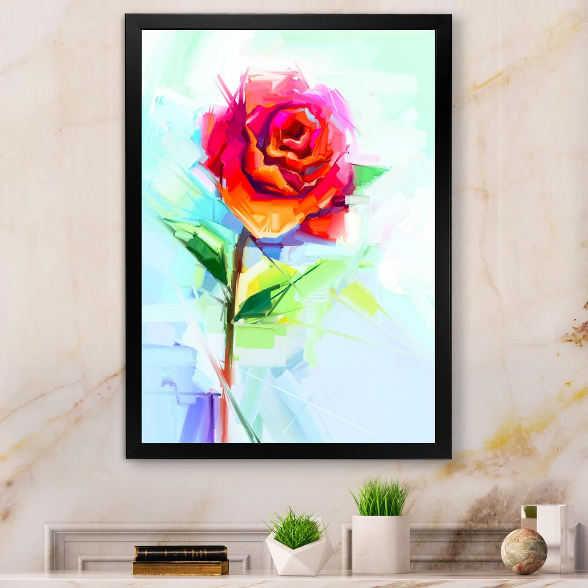 Designart "Paintbursh Turquoise Red Rose" Modern Framed Art Print