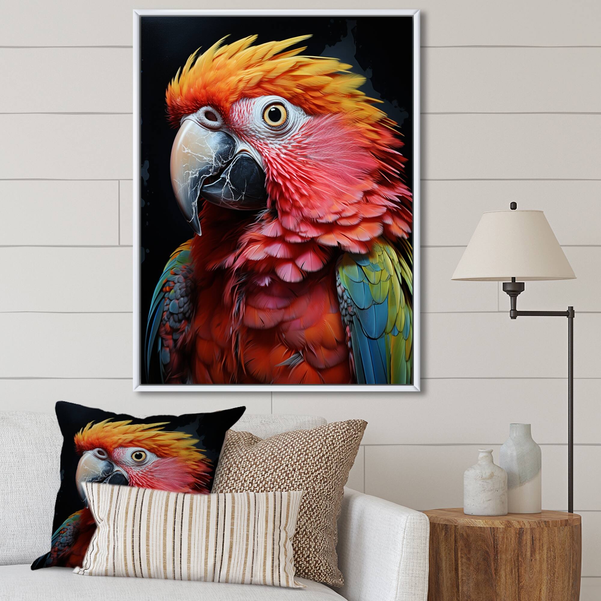 Designart "Yellow Red Parrot Colorful Parrot Pointillism" Parrot Framed Canvas Print