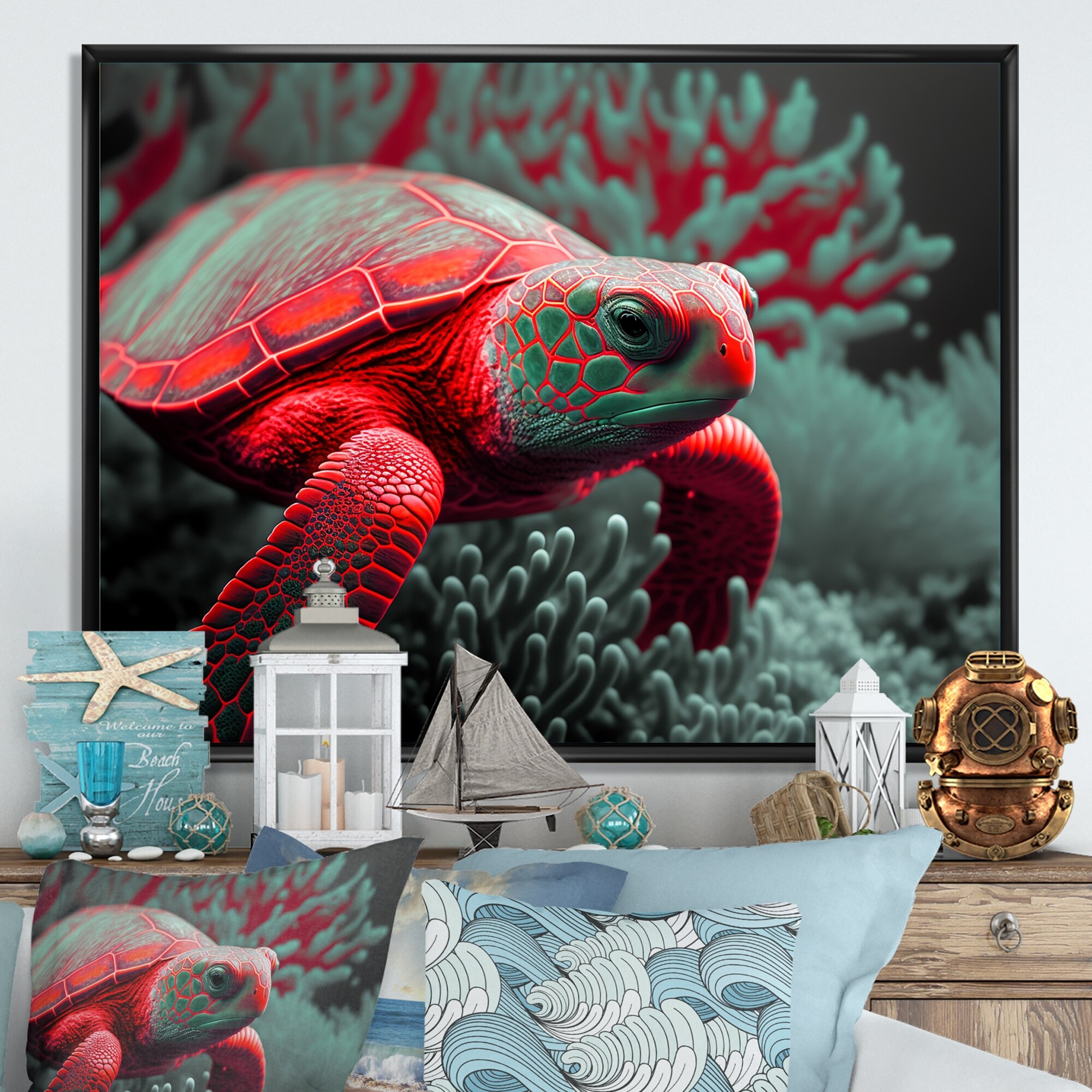 Designart "Black And Red Deep Sea Turtle I" Animals Turtle Framed Canvas Wall Art Print