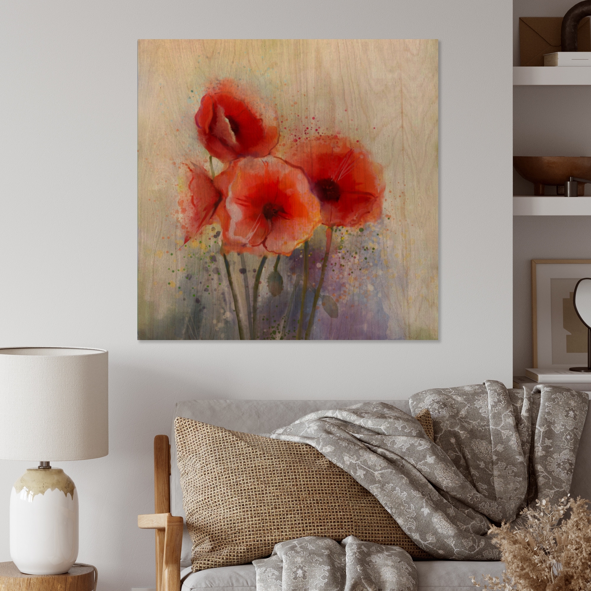 Designart 'Paintbrush Red Poppy Bouquet' Traditional Wood Wall Art Décor - Natural Pine Wood