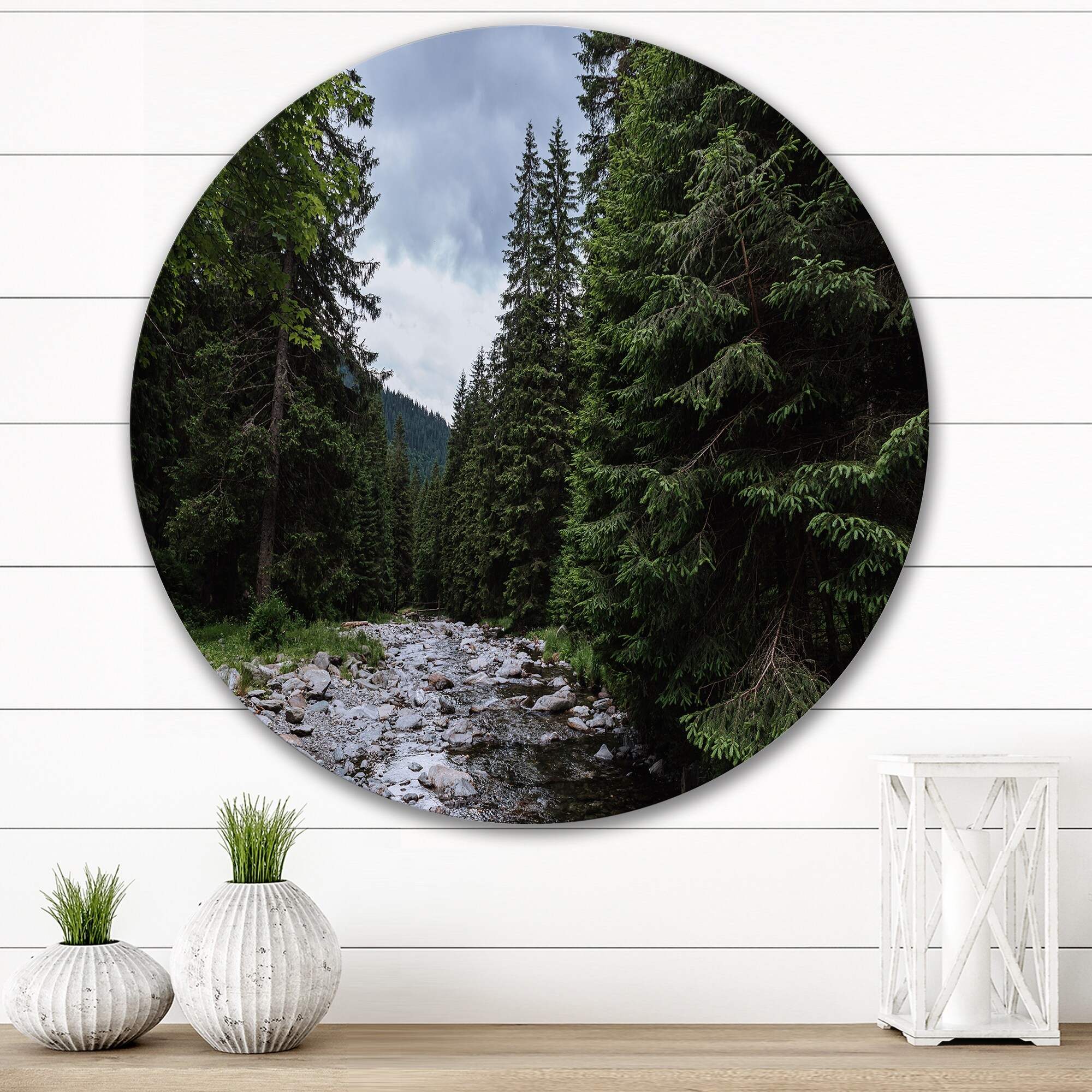 Designart 'Mountain Landscape With River And Forest Trees' Traditional Metal Circle Wall Art