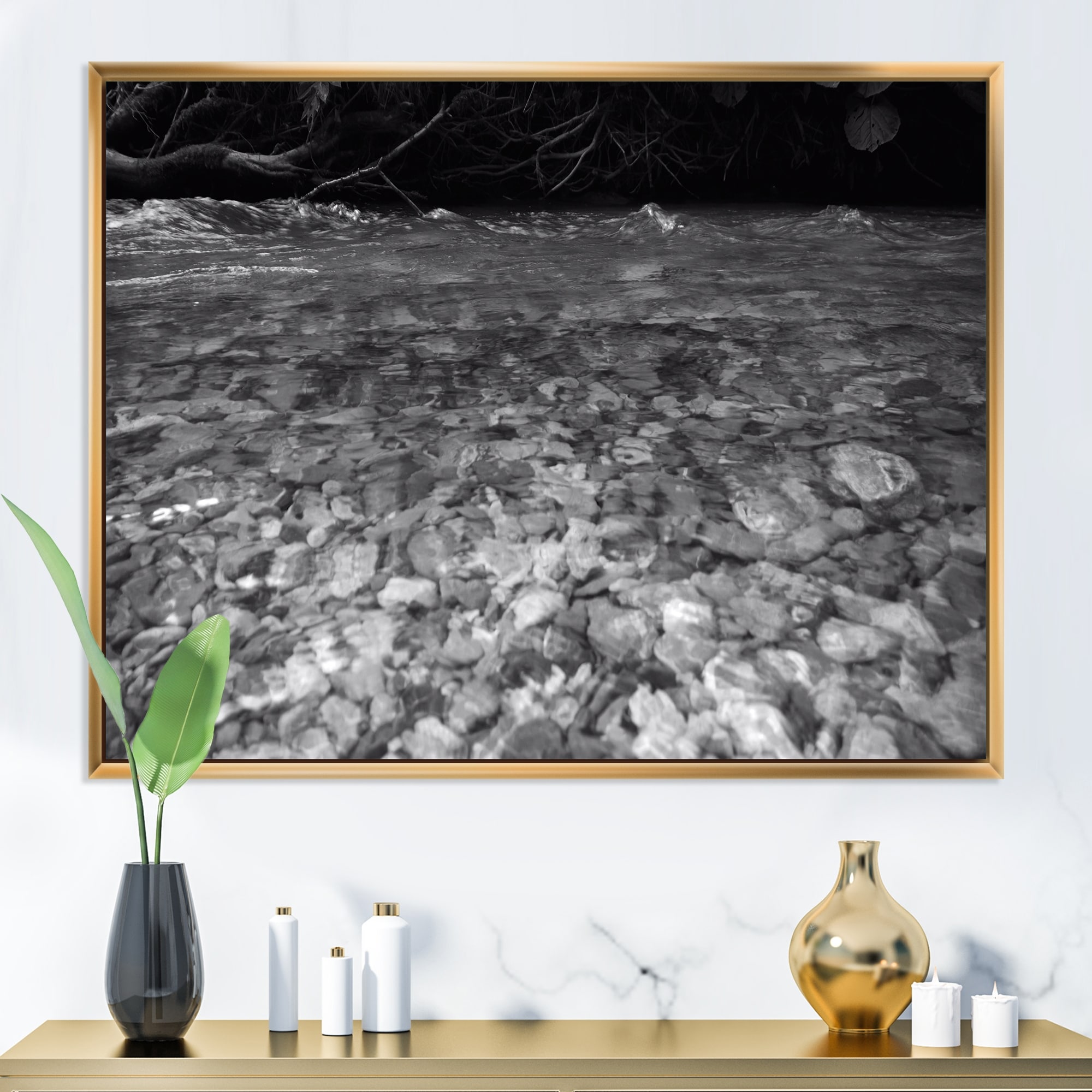 Designart "River And Grey Stones" Traditional Framed Canvas Wall Art Print