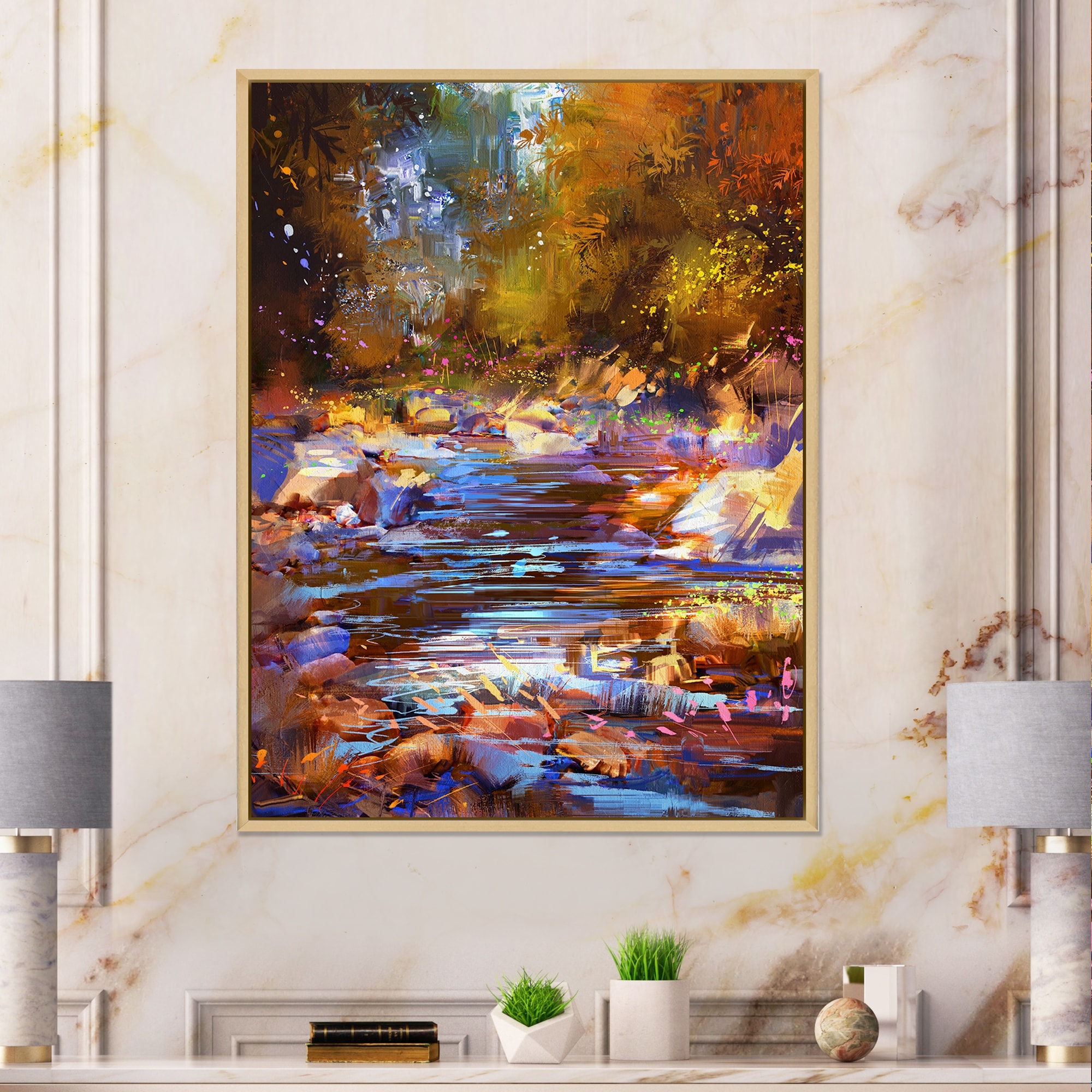 Designart "Fall River Lines With Colorful Stones in Forest" Traditional Framed Canvas Wall Art Print