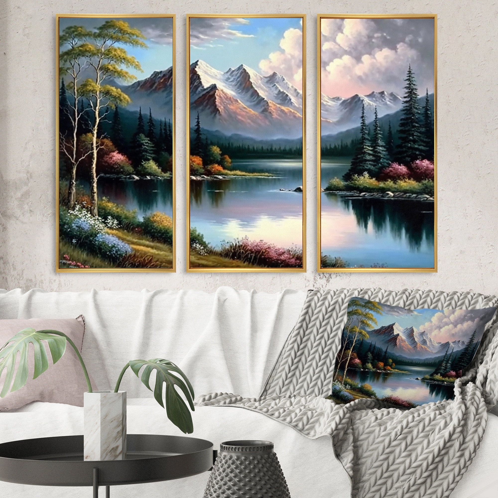Designart "River Quietude in the Afternoon" Landscape Mountains Framed Canvas Wall Art Print - 3 Panels