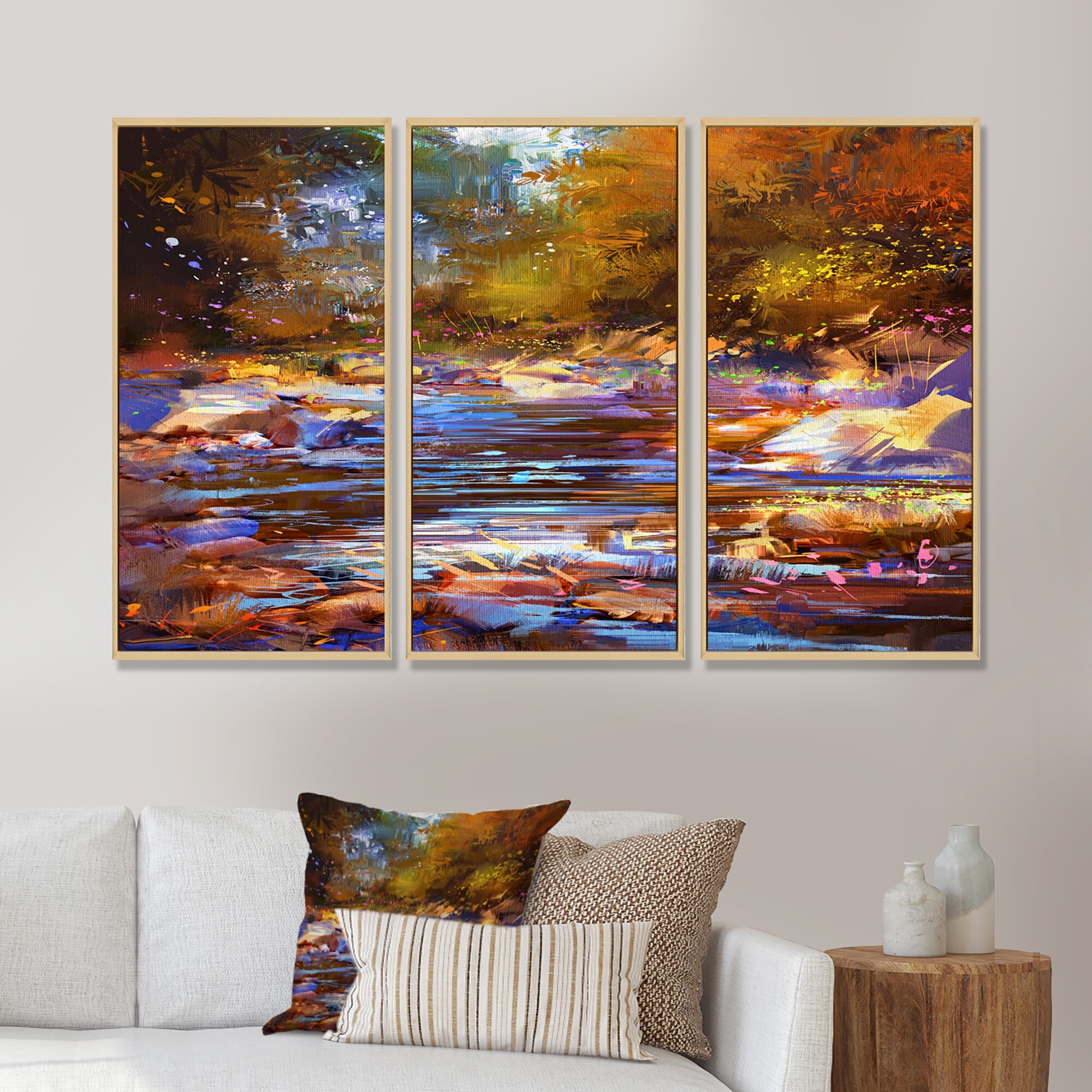 Designart "Fall River Lines With Colorful Stones in Forest" Traditional Framed Wall Art Set of 3 - 4 Colors of Frames