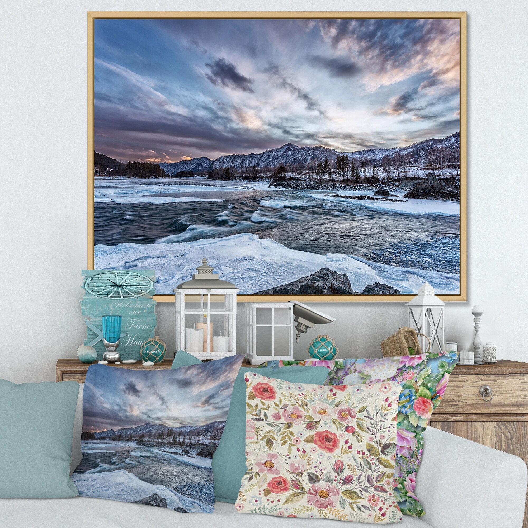 Designart "Old Mountain River Among Snow At Sunrise" Lake House Framed Canvas Wall Art Print