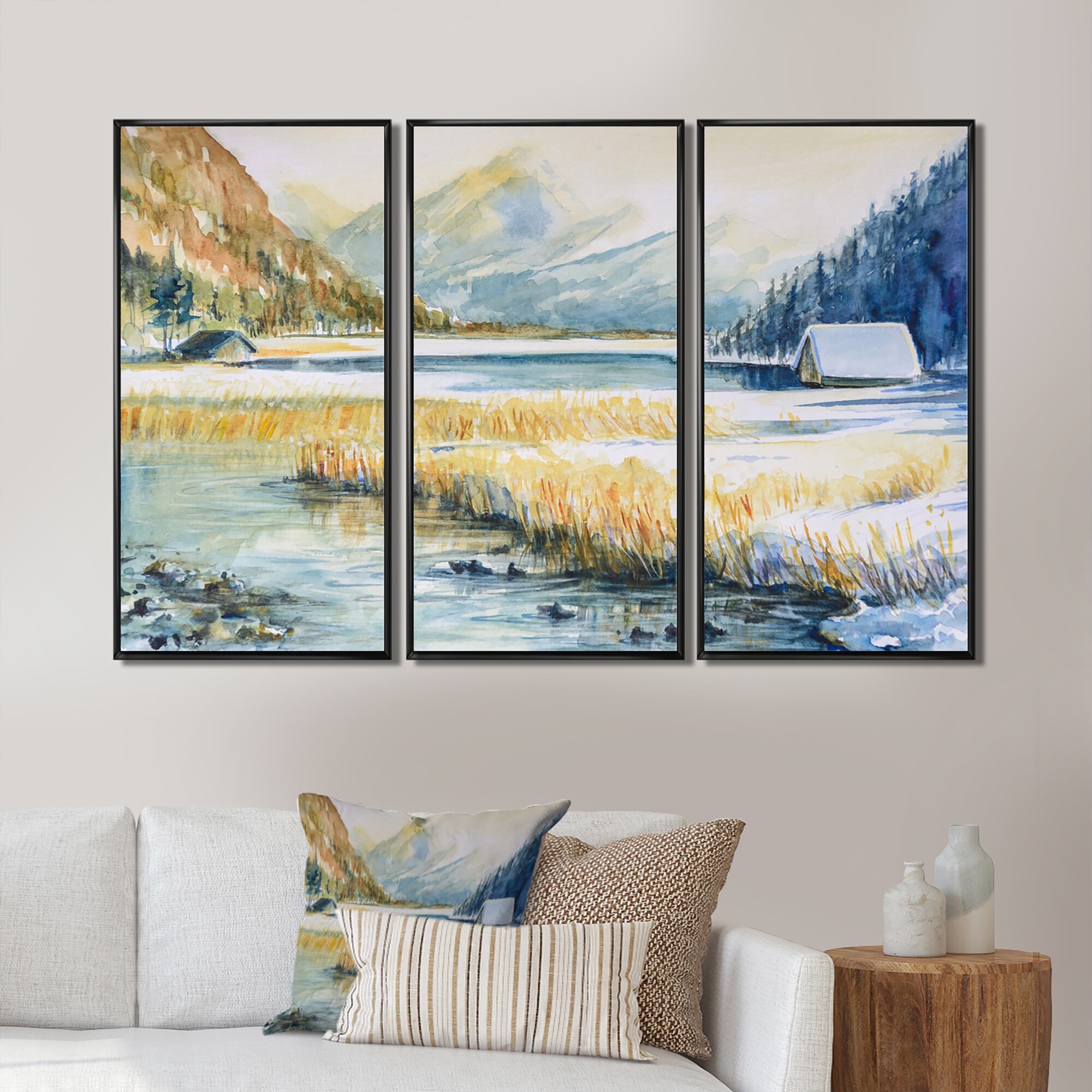 Designart "Landscape With Blue Mountain And River" Traditional Framed Wall Decor Set of 3 - 4 Colors of Frames