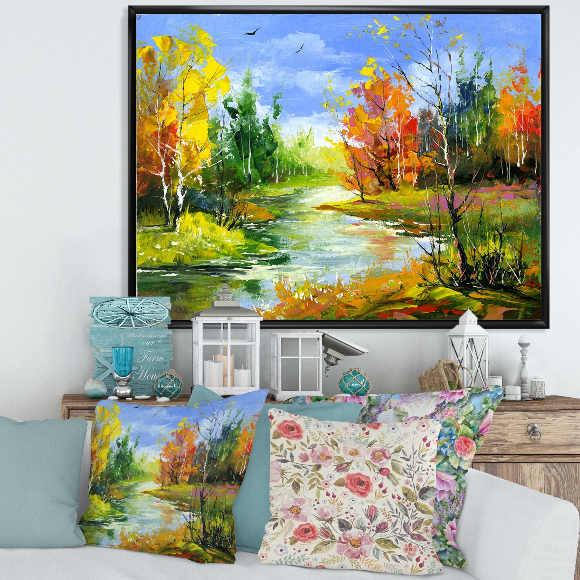 Designart "Autumn Landscape With River Under A Blue Sky" Country Framed Canvas Wall Art Print