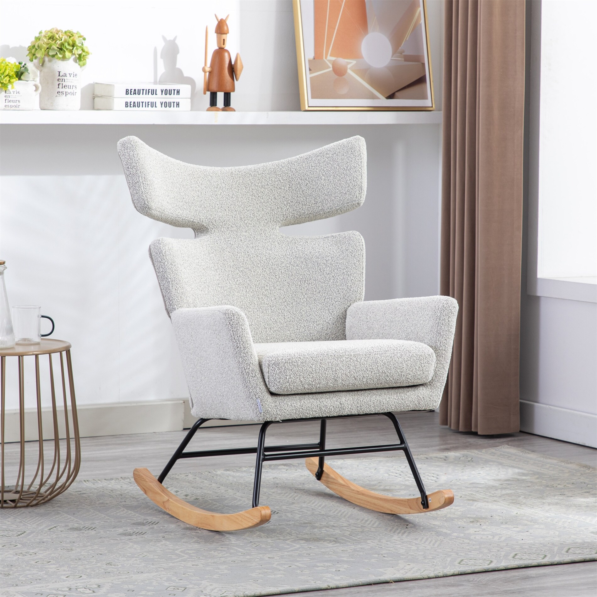 Mid-Century Fabric Rocking Chair Sofa Armchair Tufted Rocker Wingback Accent Chair with Padded Seat, Rubber Wood Base