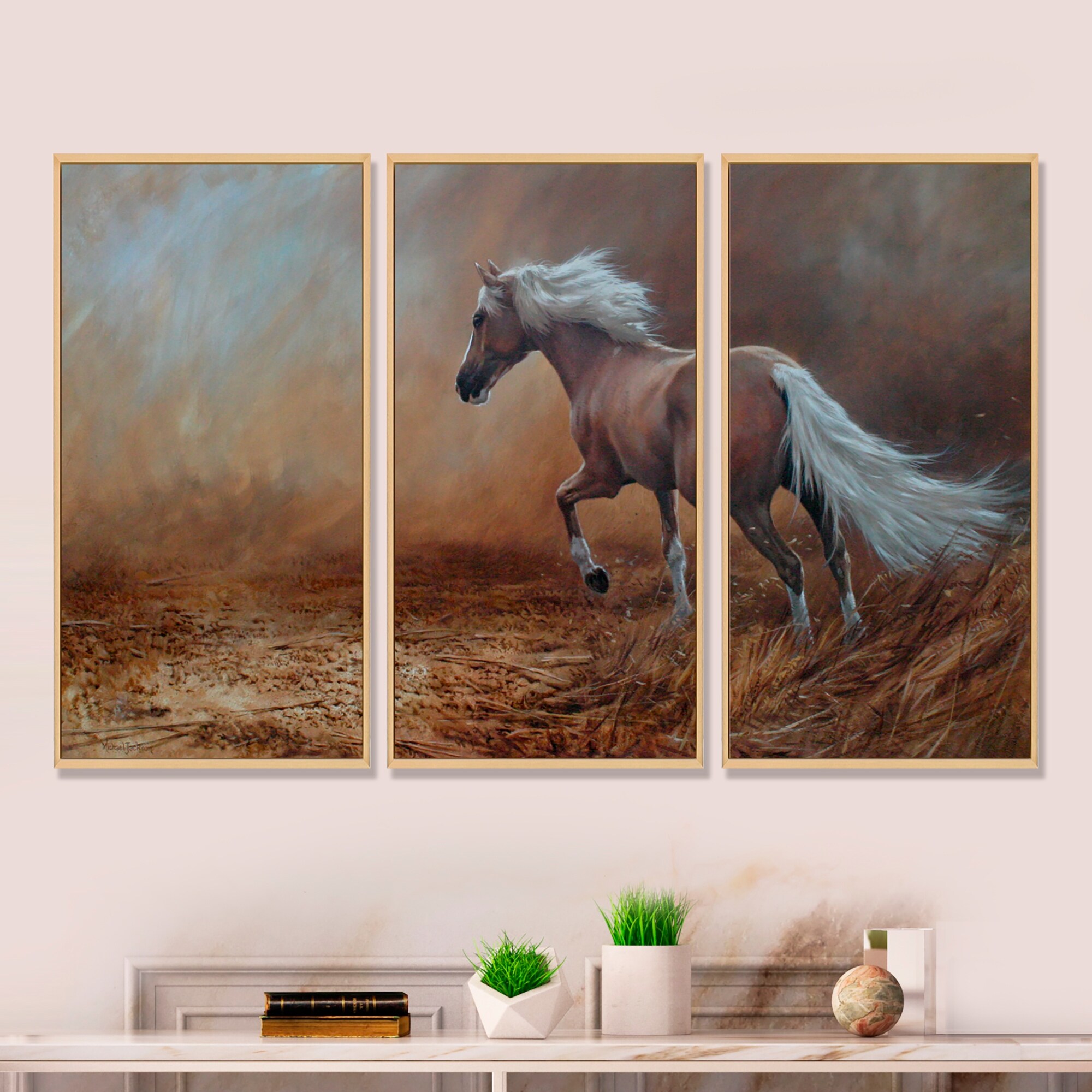 Designart "White Horse With Long Manes Run Gallop on Desert" Traditional Framed Wall Decor Set of 3 - 4 Colors of Frames