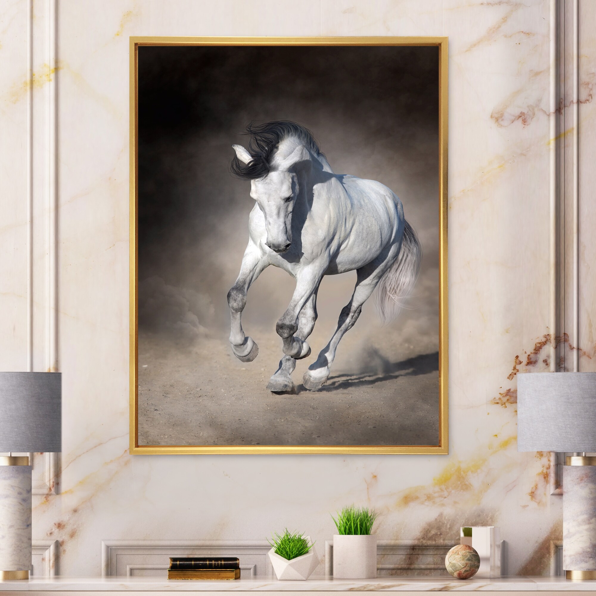 Designart "White Horse With Long Manes Run Gallop on Desert" Traditional Framed Canvas Wall Art Print