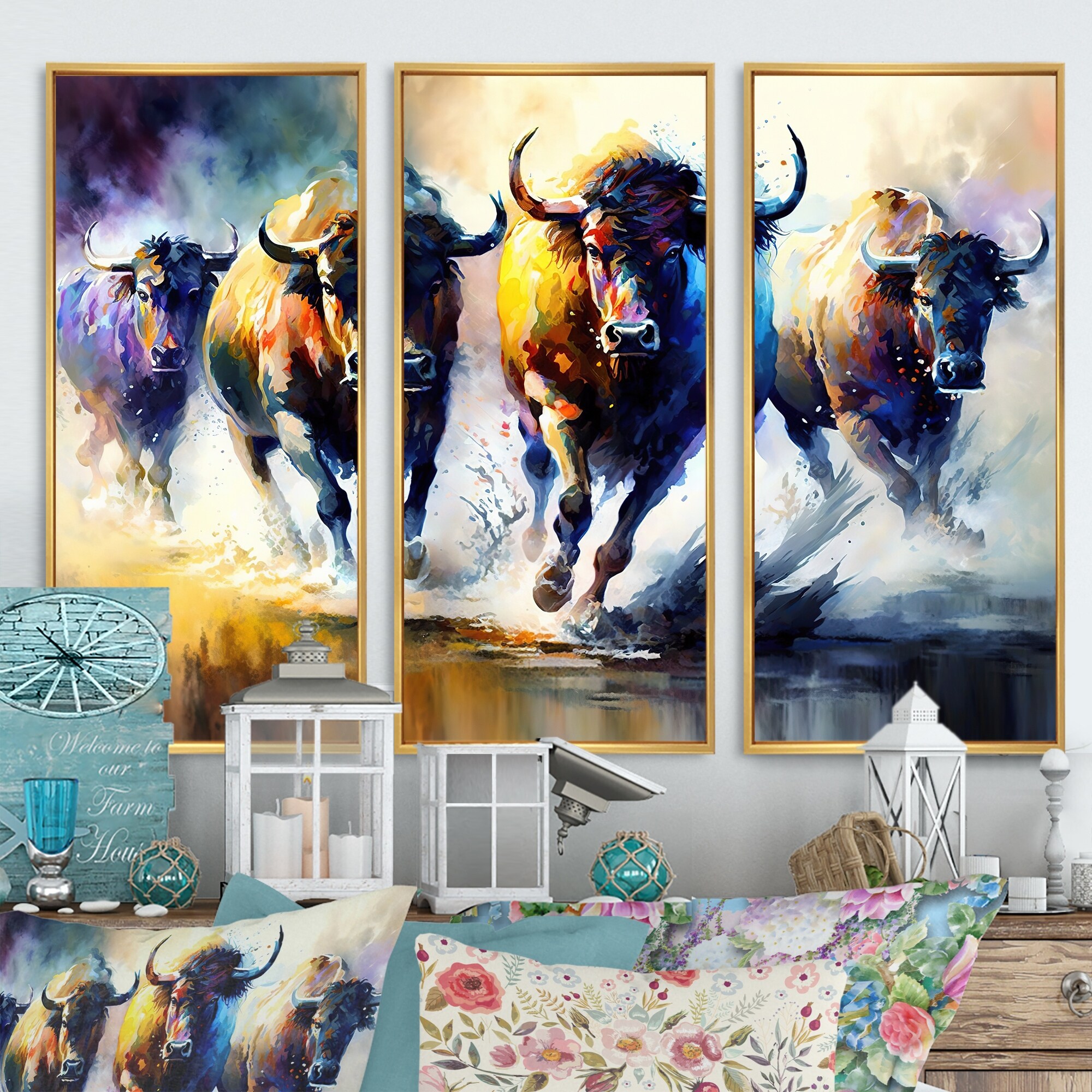 Designart "Buffalo"S Running" Animals Buffalo Framed Canvas Art Print - 3 Panels