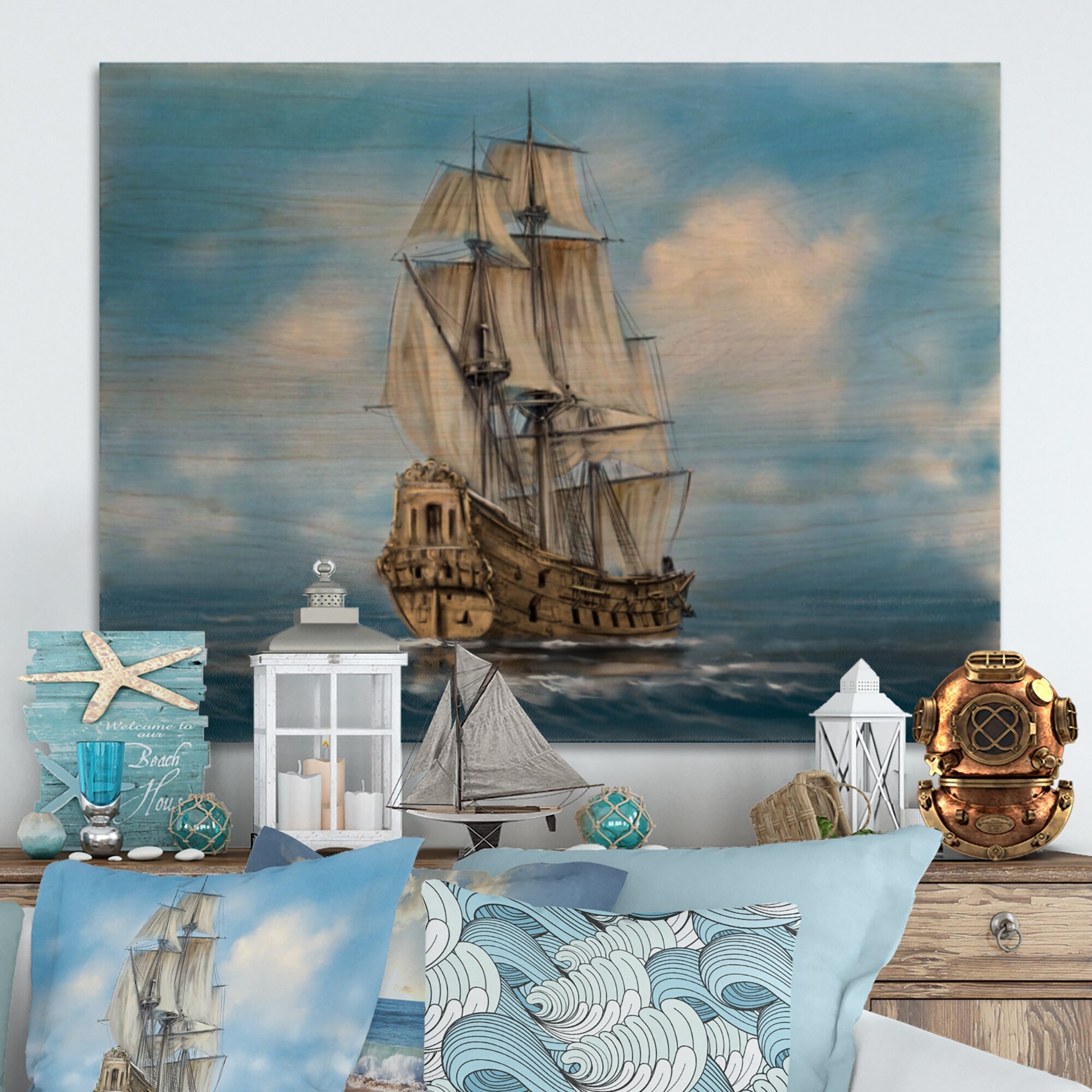 Designart 'Old Naval Ship II' Nautical & Coastal Wood Wall Art Décor - Natural Pine Wood