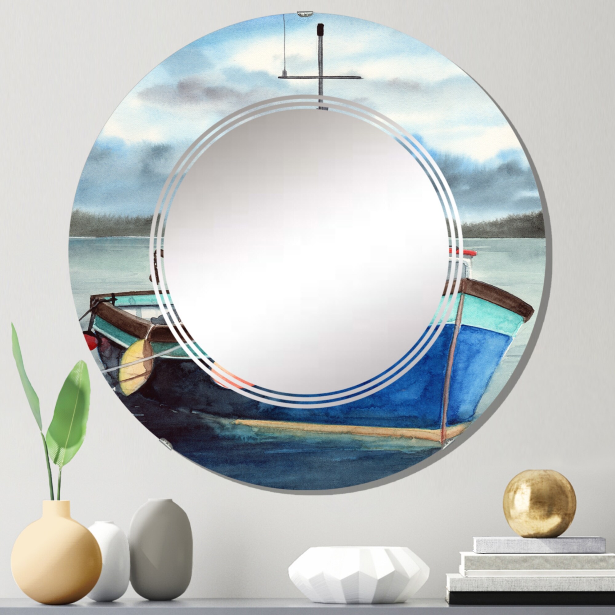 Designart 'Blue Fishing Ship With Red Roof in the Harbor' Nautical & Coastal Printed Wall Mirror