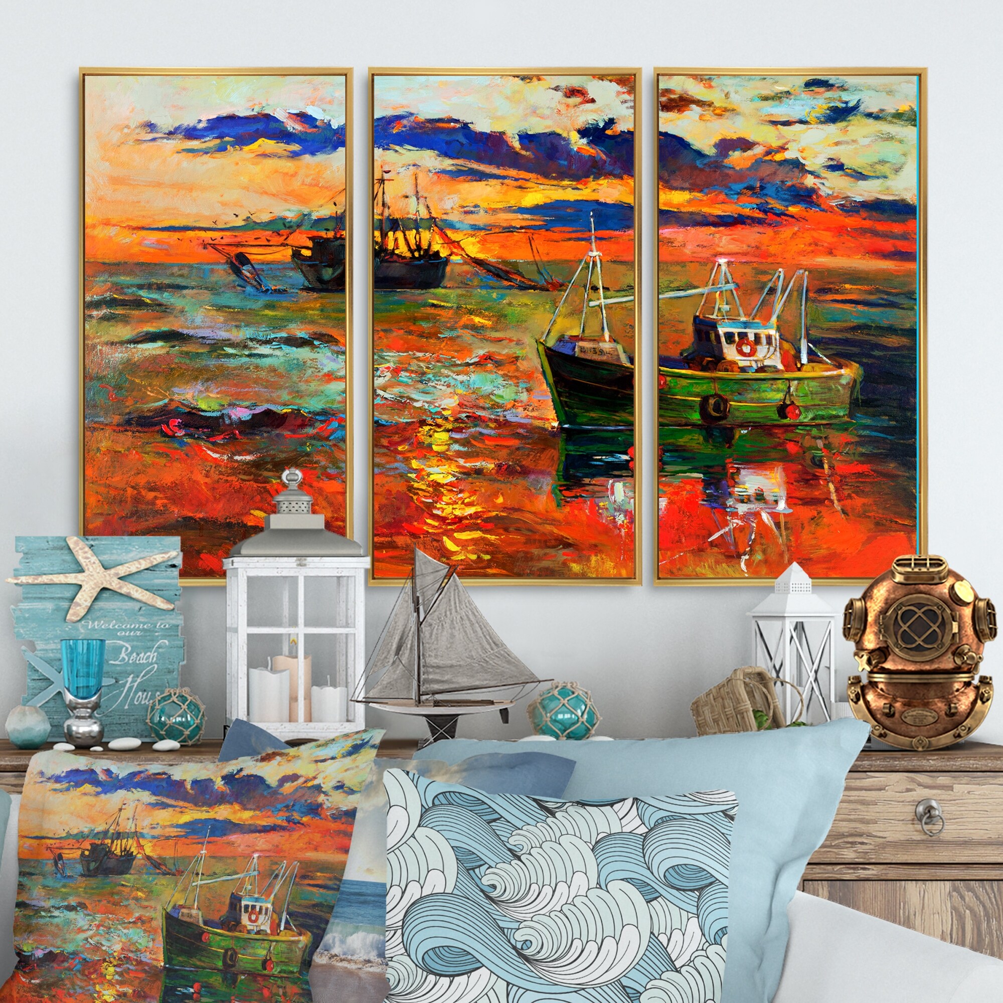 Designart "Colorful Fishing Ships" Sea & Shore Framed Canvas Wall Art Set of 3 - 4 Colors of Frames