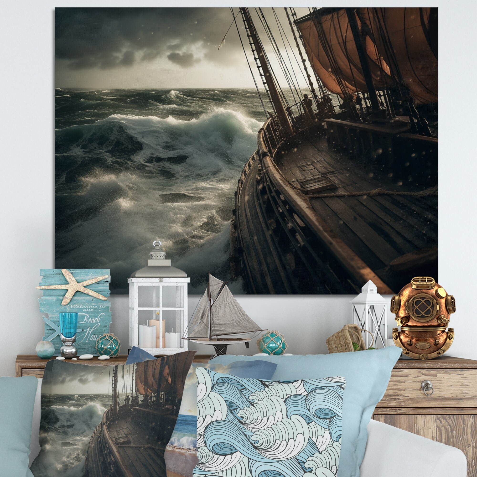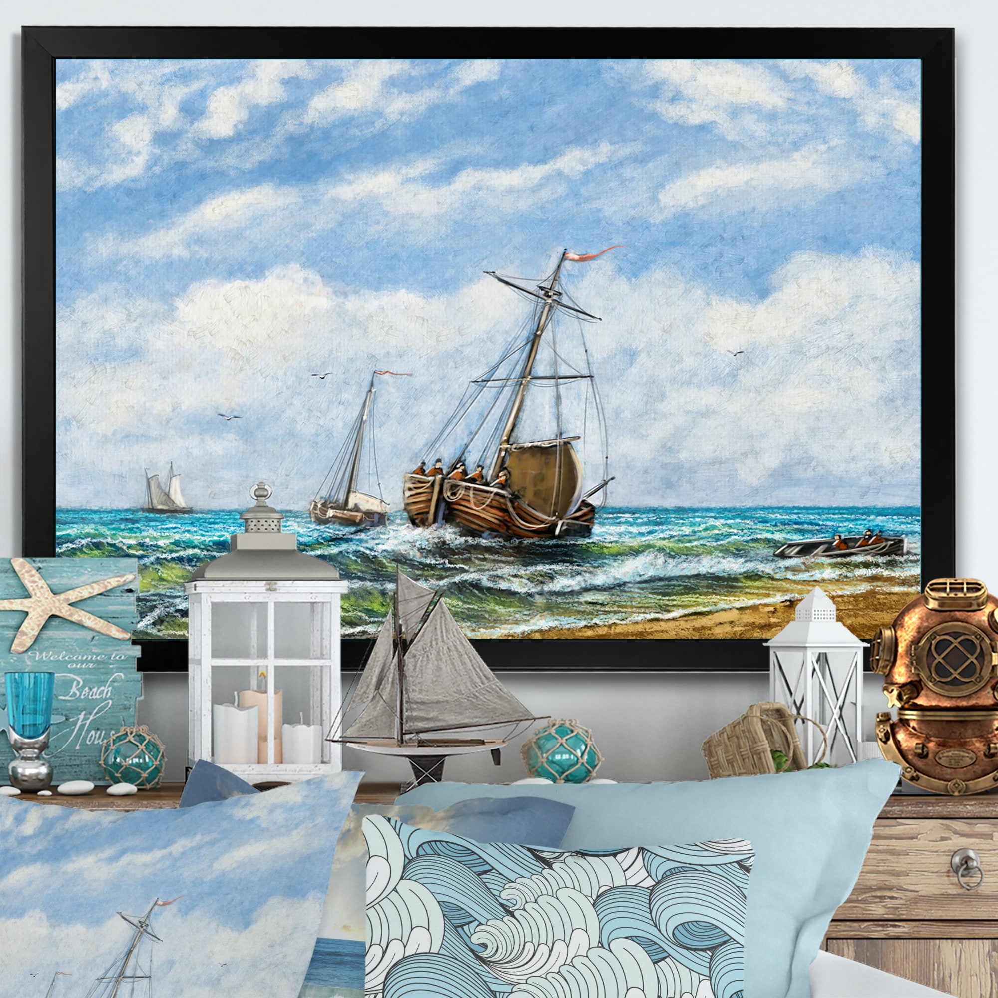 Designart "Ship In the Middle of a Storm I" Modern Landscape Beach Framed Canvas Wall Art