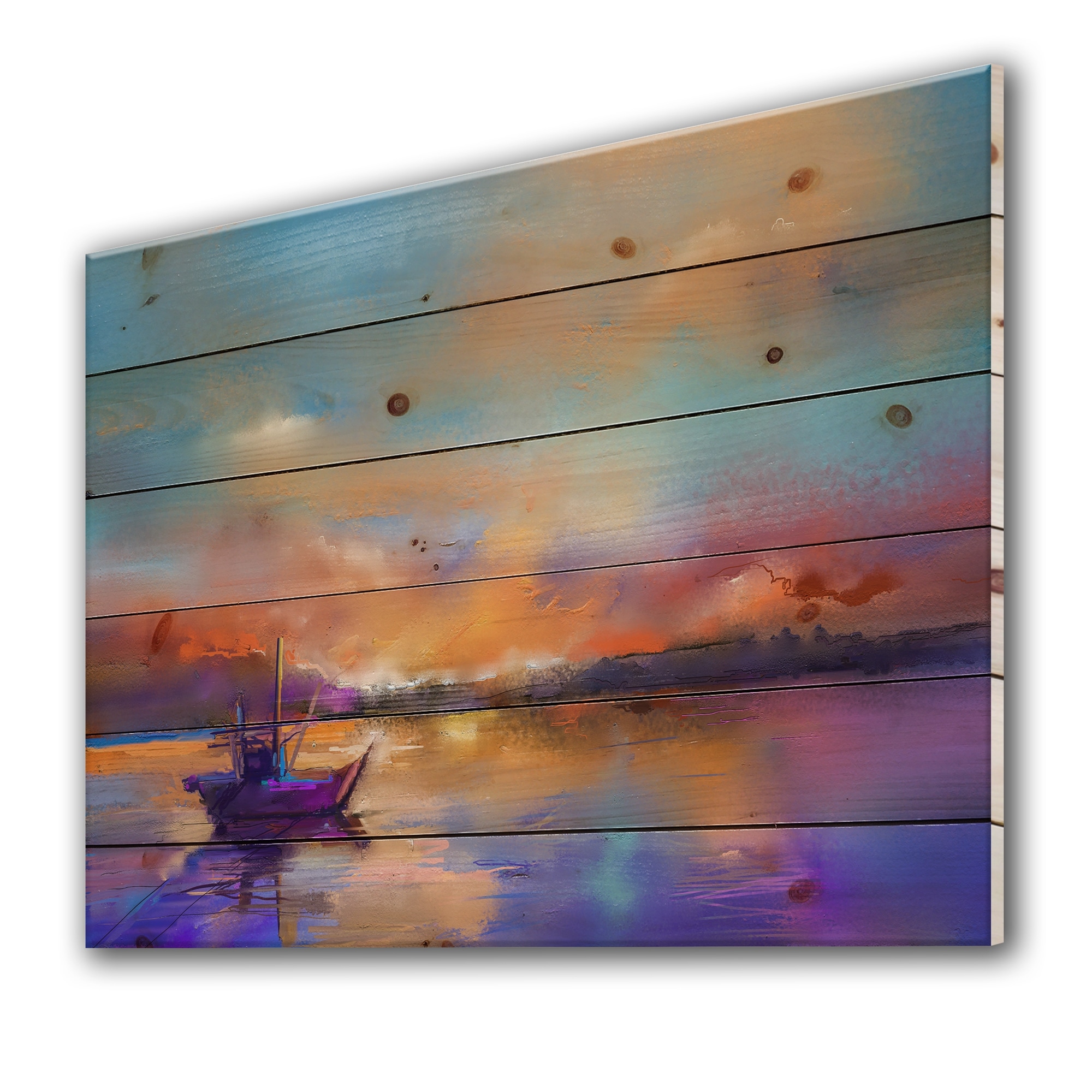 Designart 'Purple Sunset Seascape With Little Ship At the Horizon Horizon I' Modern Print on Natural Pine Wood
