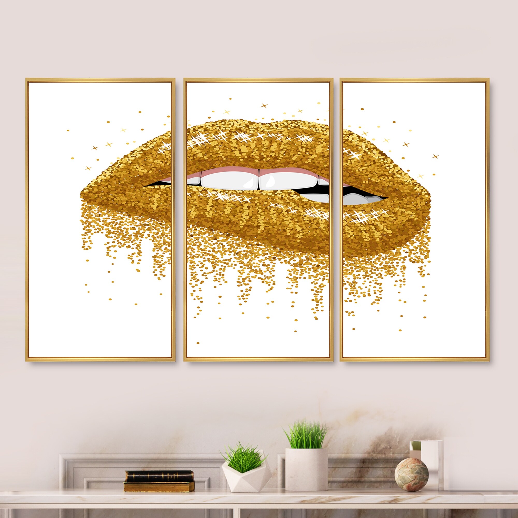 Designart "Woman Lips With Glitter Gold Sparkles" Modern Framed Canvas Wall Art Print Set of 3 - 4 Colors of Frames