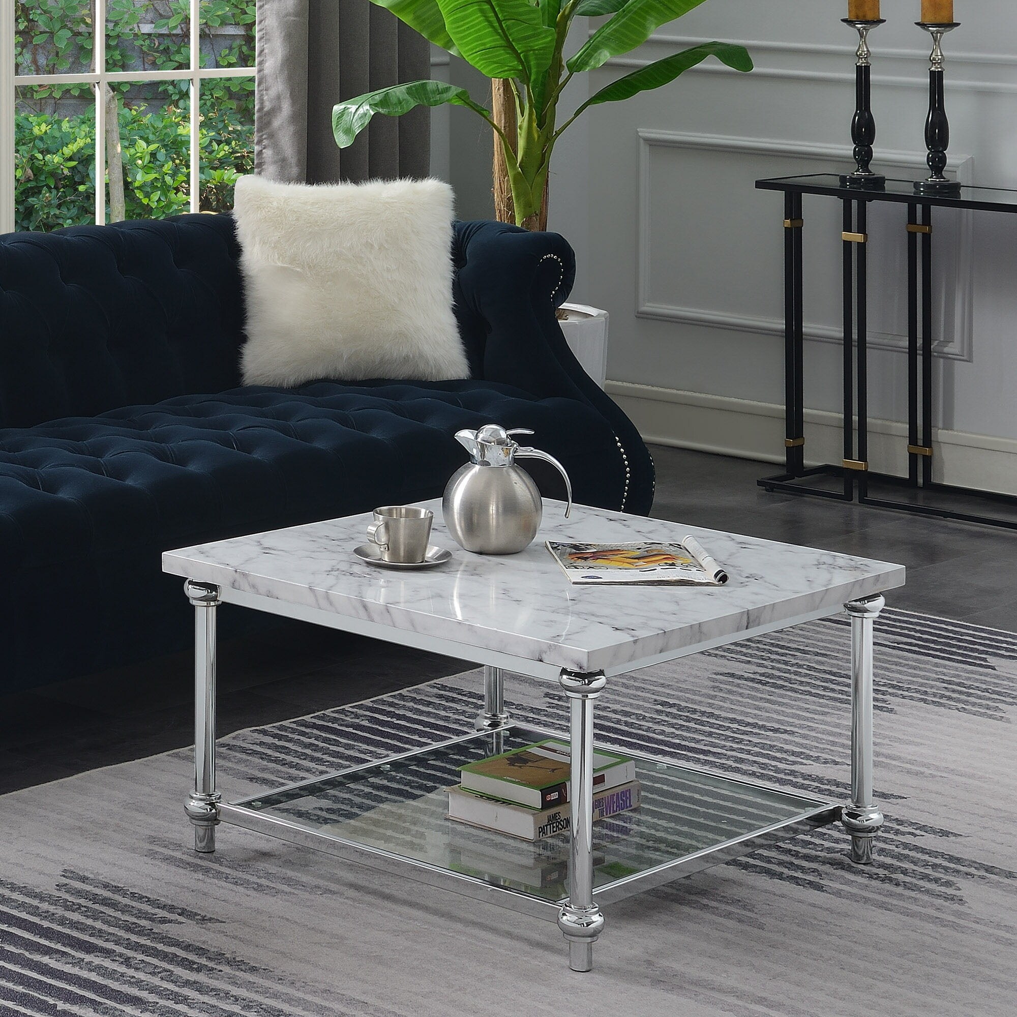 Roman II Square Coffee Table with Shelf, White Faux Marble/Chrome