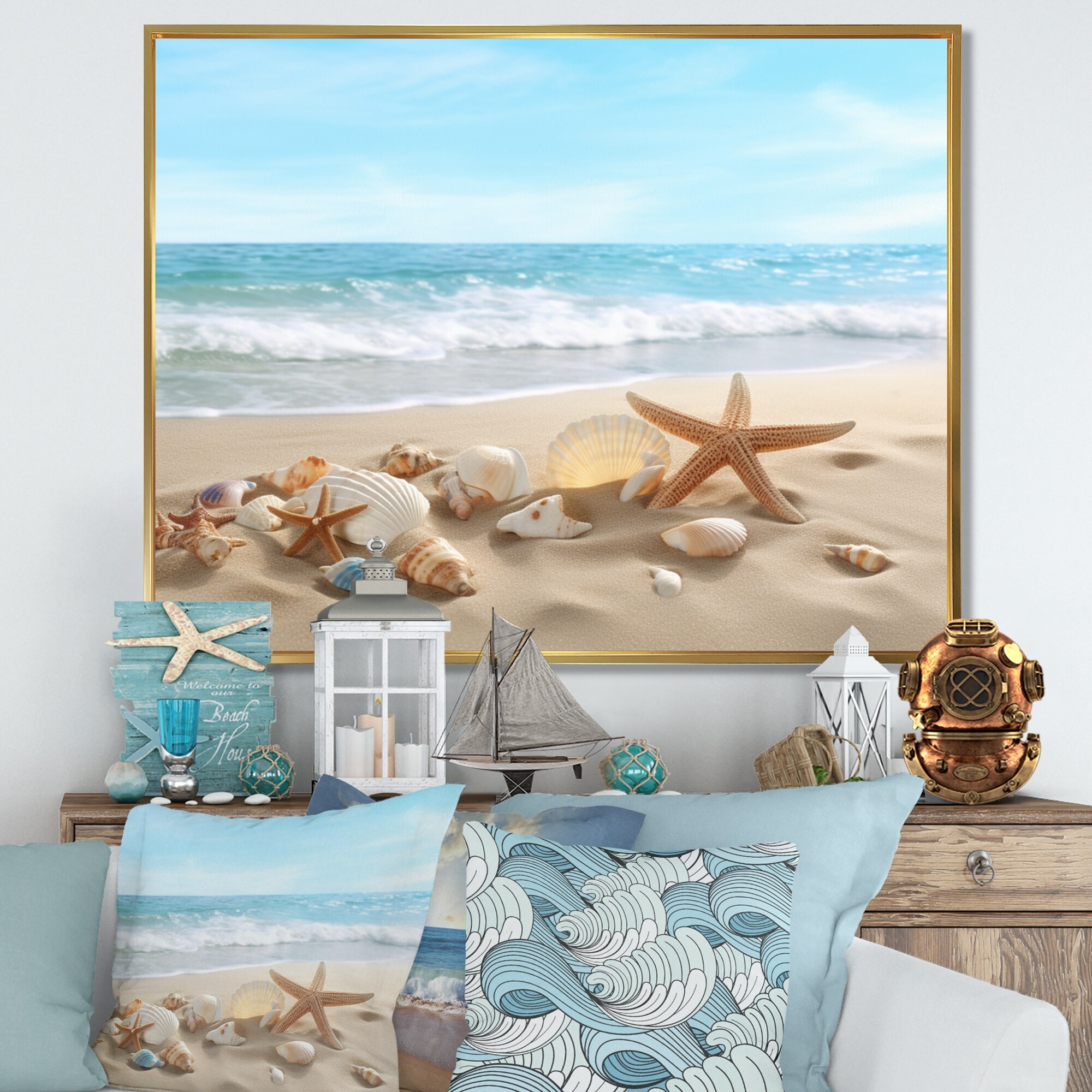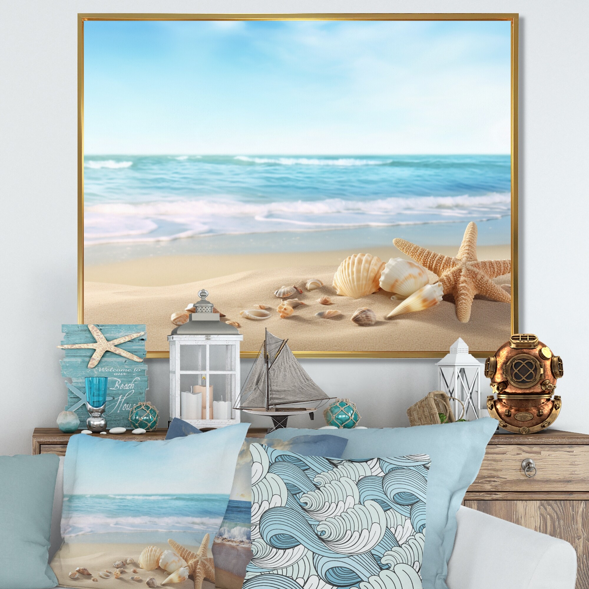 Designart "Starfish And Seashells V" Modern Landscape Beach Framed Canvas Wall Art