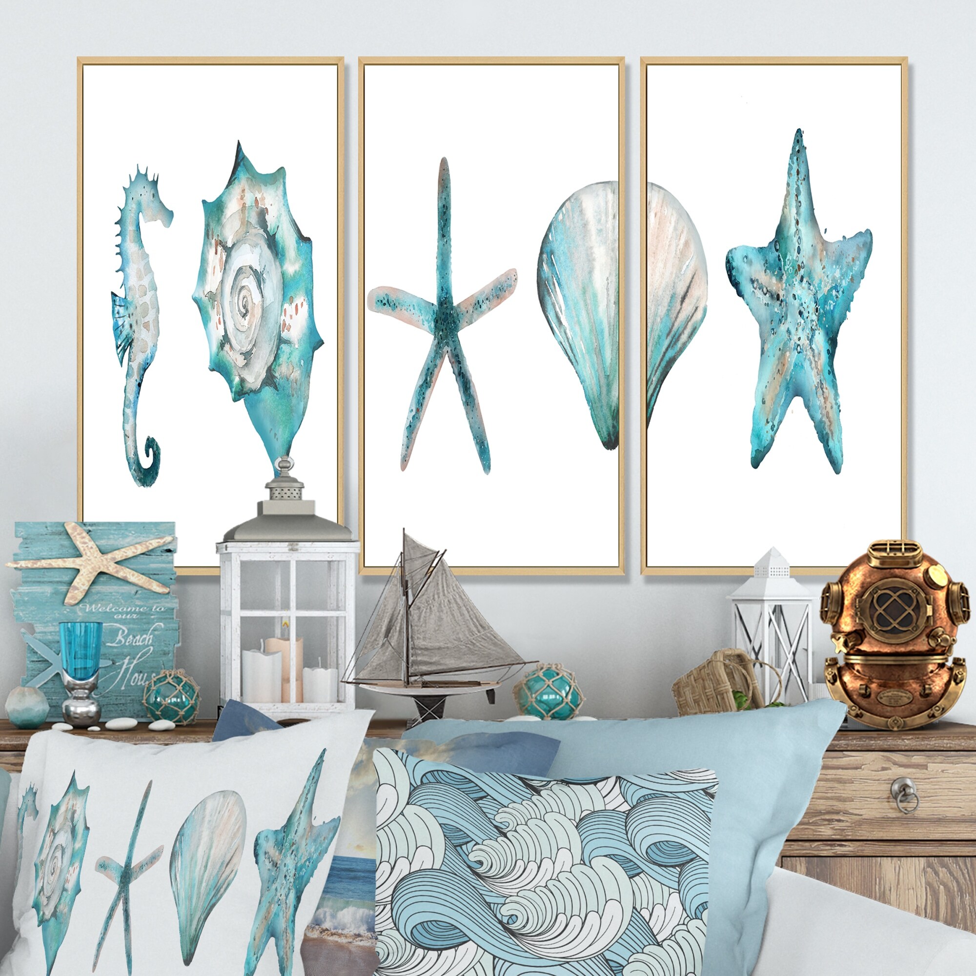 Designart "Blue Starfish And Shell" Nautical & Coastal Framed Wall Art Set of 3 - 4 Colors of Frames