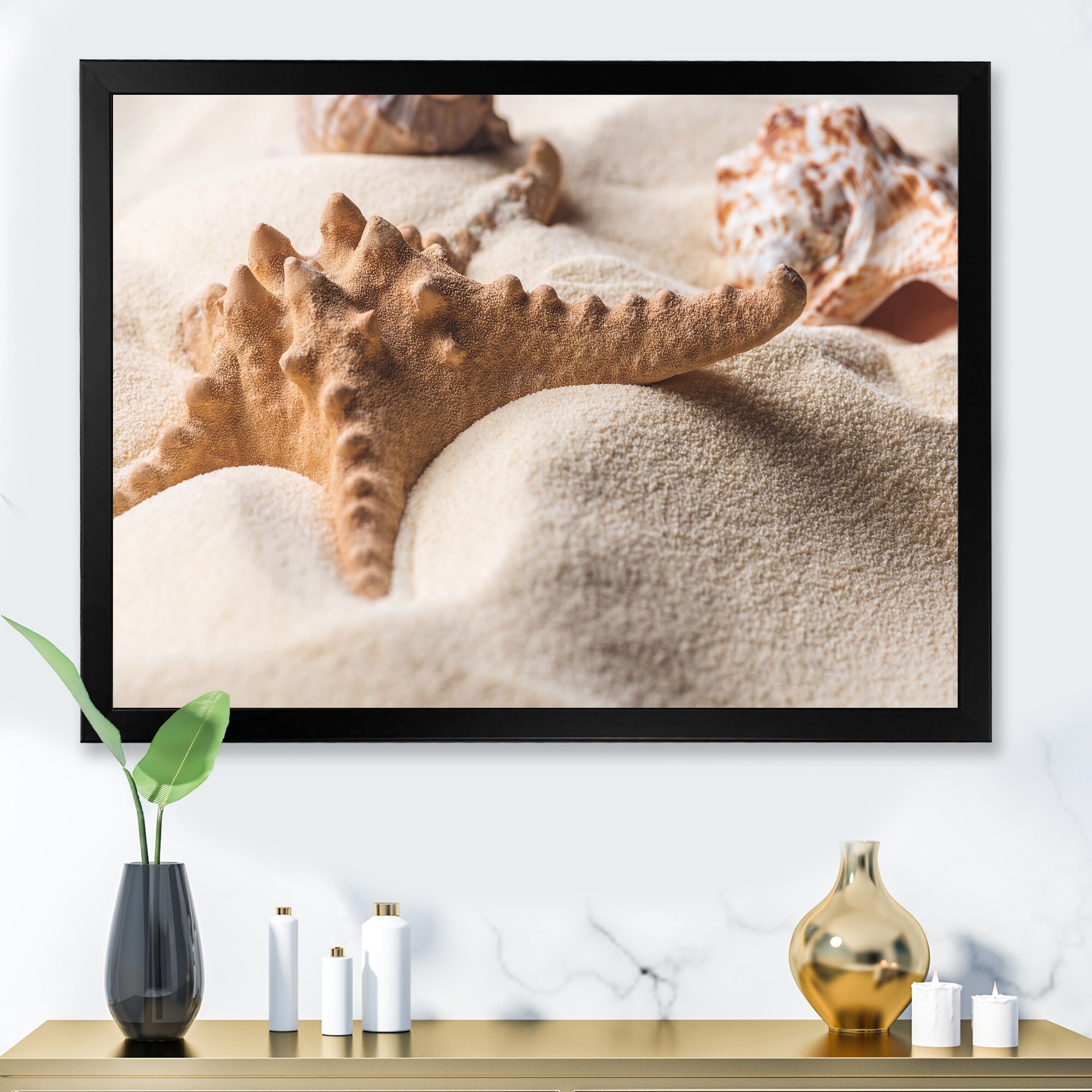 Designart "Starfish And Seashell on Light Sand" Nautical & Coastal Framed Art Print