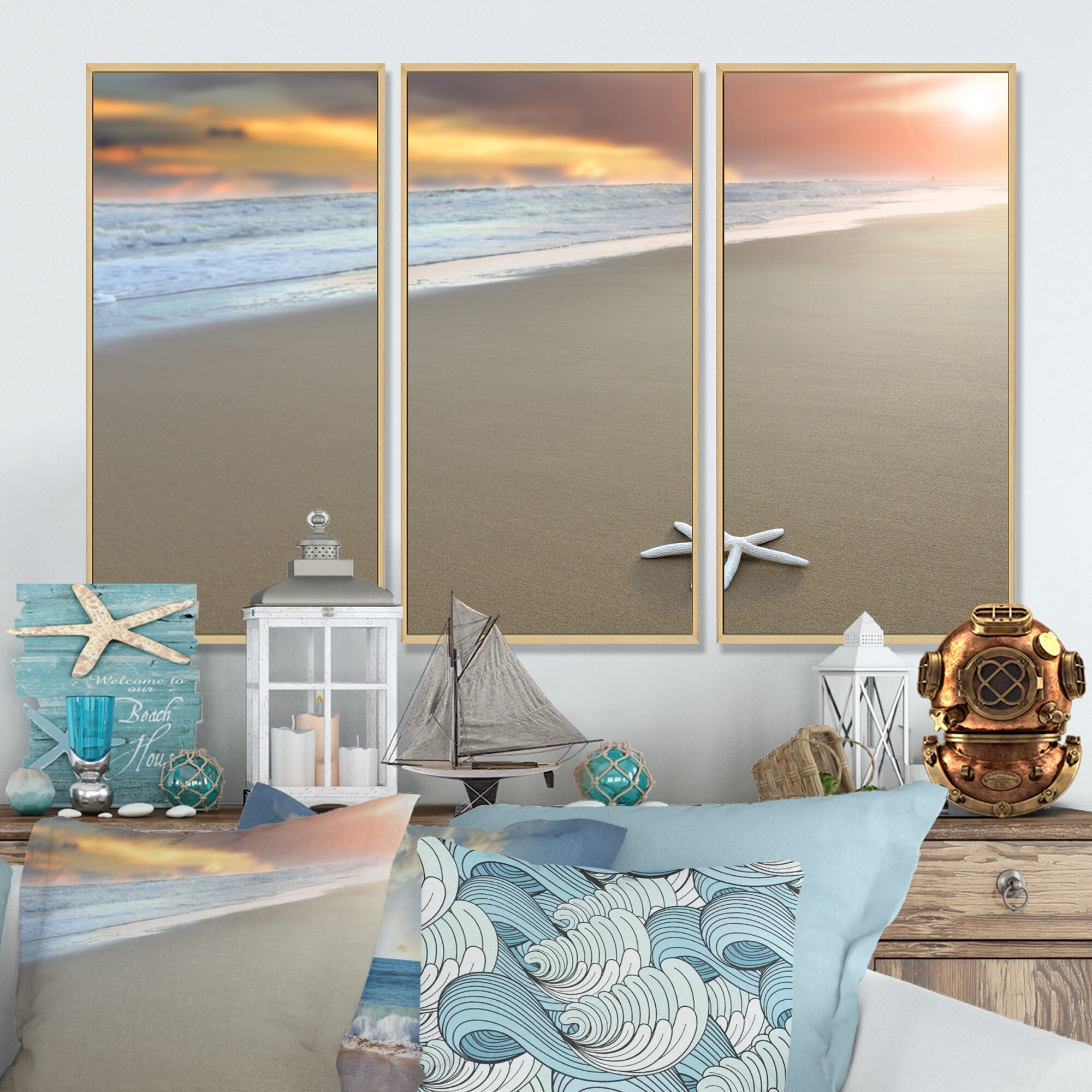Designart "Starfish And Seashell on Light Sand" Nautical & Coastal Framed Canvas Wall Art Set of 3 - 4 Colors of Frames
