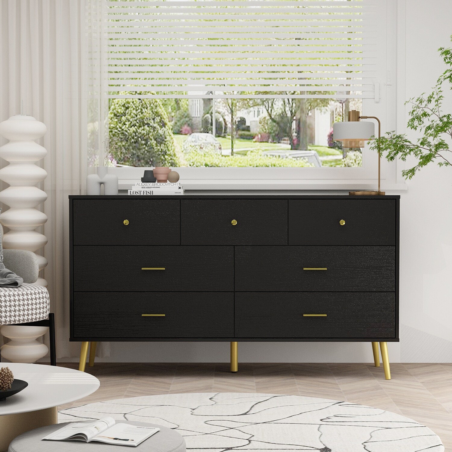 Timechee 7 Drawer 55.9'' W Dresser Chest Closet Storage White/Black