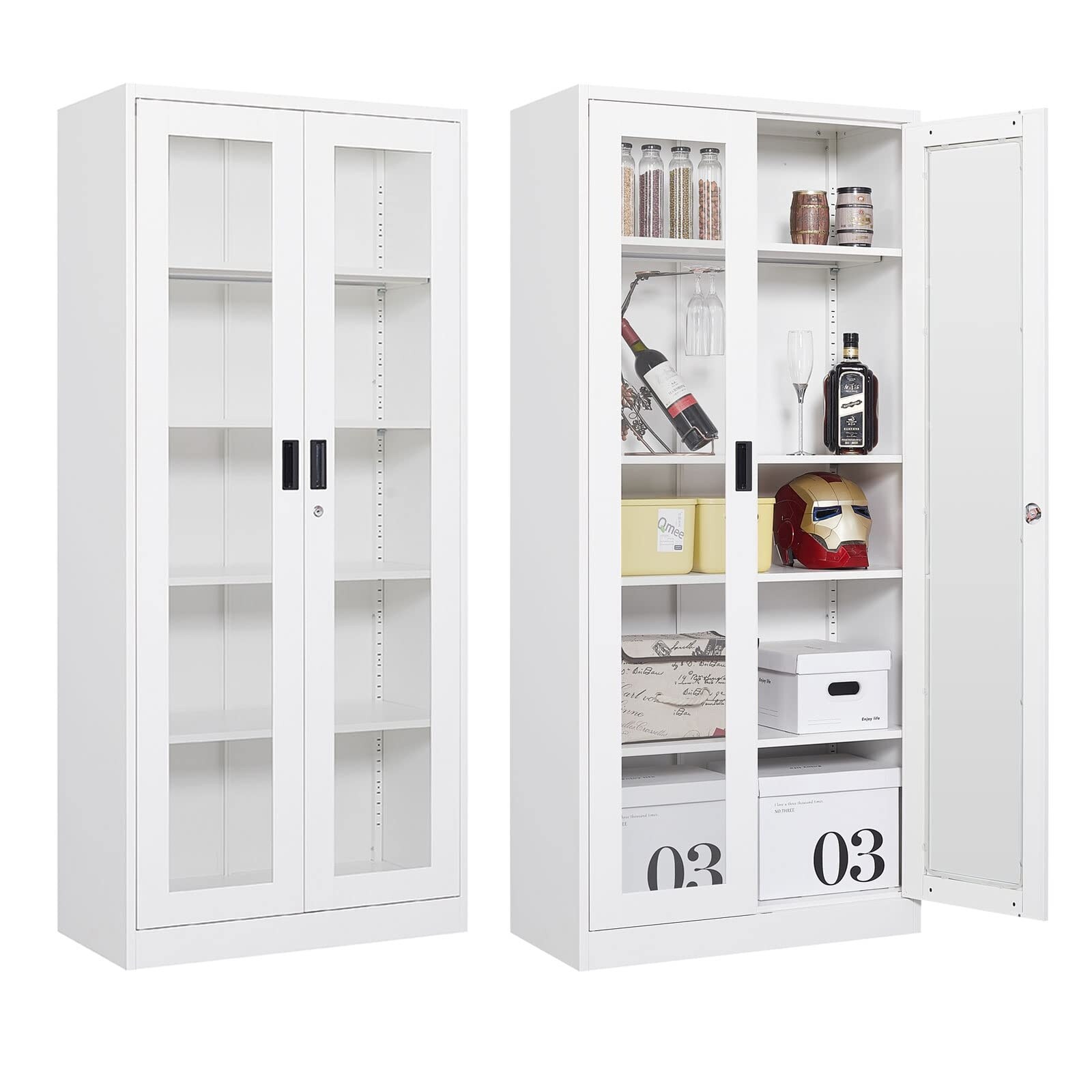 Metal Display Cabinet with Glass Doors, Glass Cabinet Tall Storage Cabinet with 4 Shelves, Glass Bookcase Bookshelf Cabinet