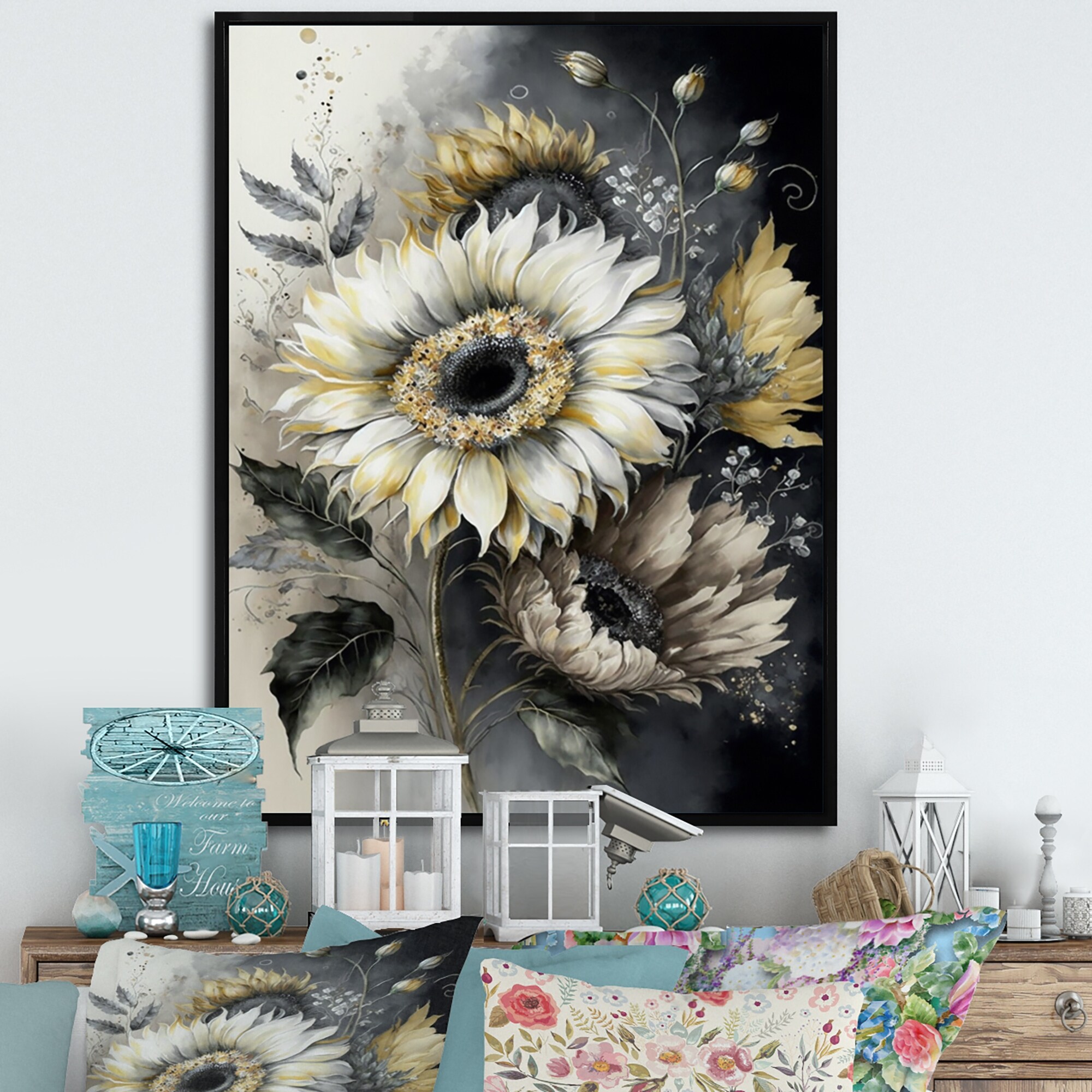Designart "White Sunflower" Floral & Botanical Framed Canvas Art Print