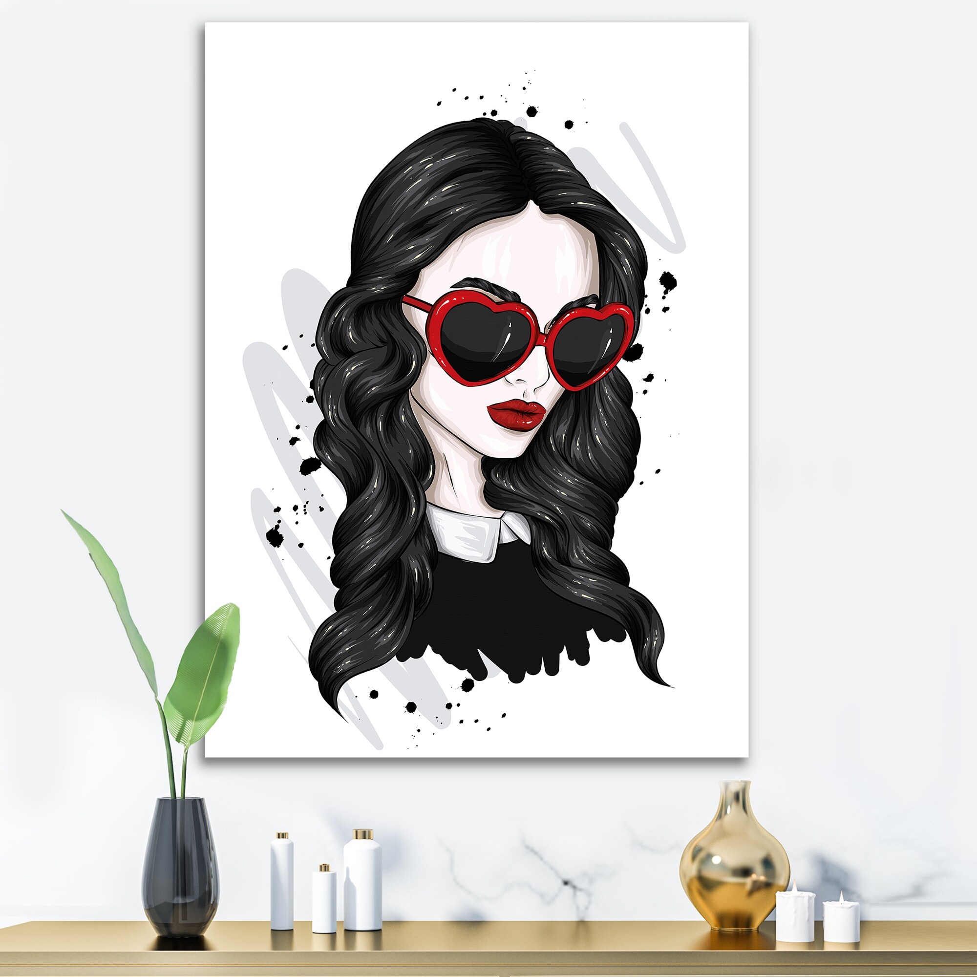 Designart "Portrait Of a Young Woman, Red Heart Sunglasses II" Modern Canvas Wall Art Print