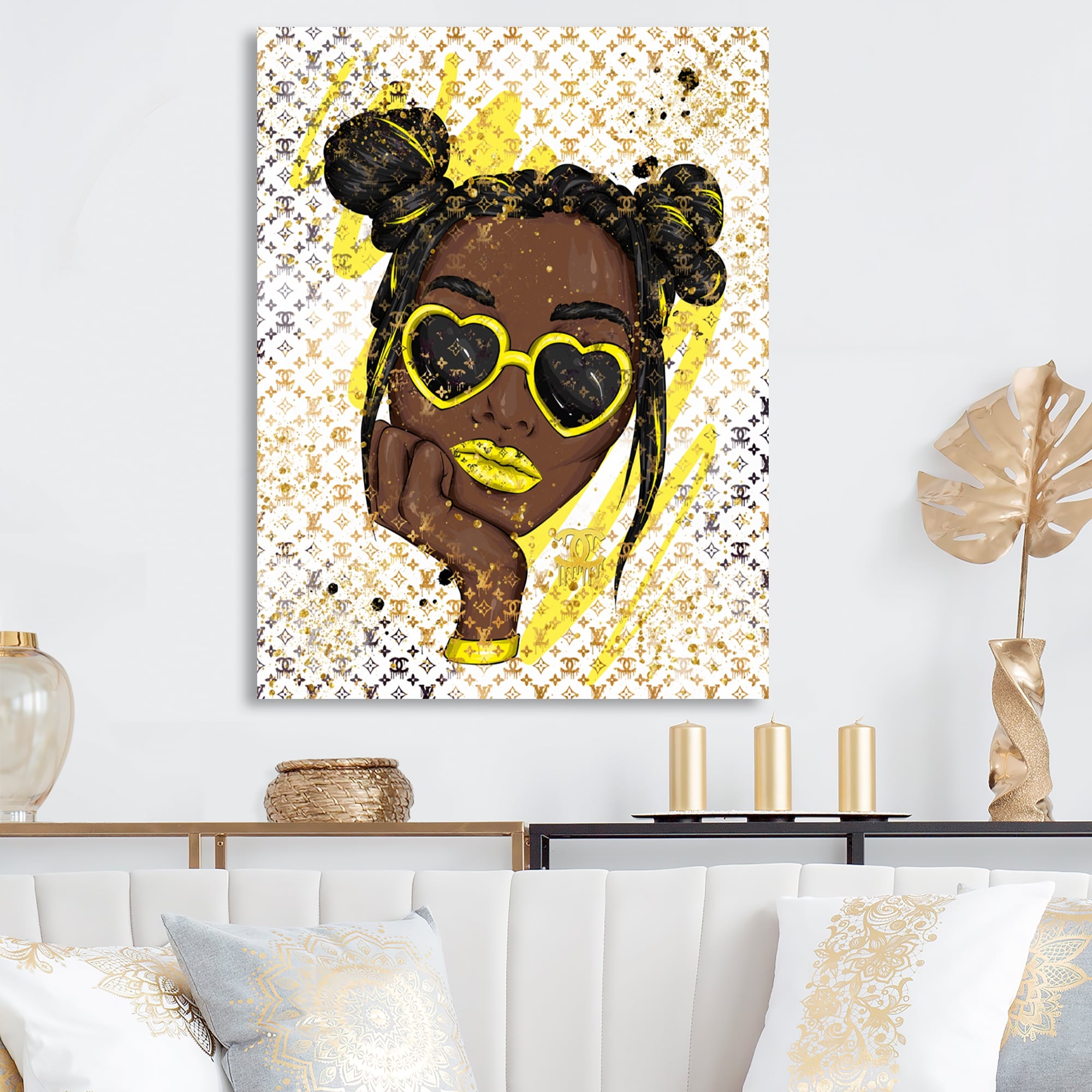 Oliver Gal Fashion and Glam Wall Art Canvas Prints 'Katy Hirschfeld - Girl and Sunglasses' Portraits - Brown, Yellow