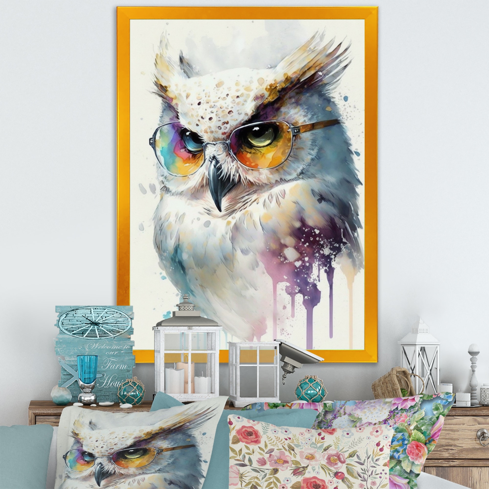 Designart "Cool White Owl With Funky Sunglasses I" Animals Owl Framed Canvas Wall Art Print