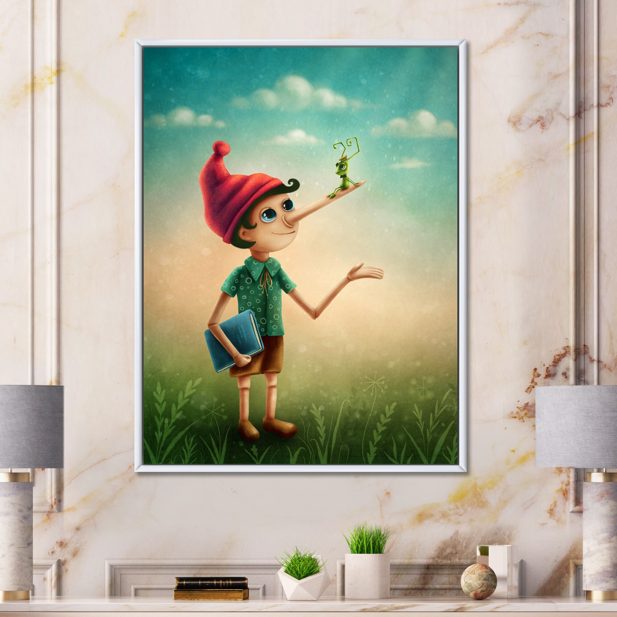 Designart "Pinocchio With Long Nose Fairy Tale Character" Children's Art Framed Canvas Wall Art Print