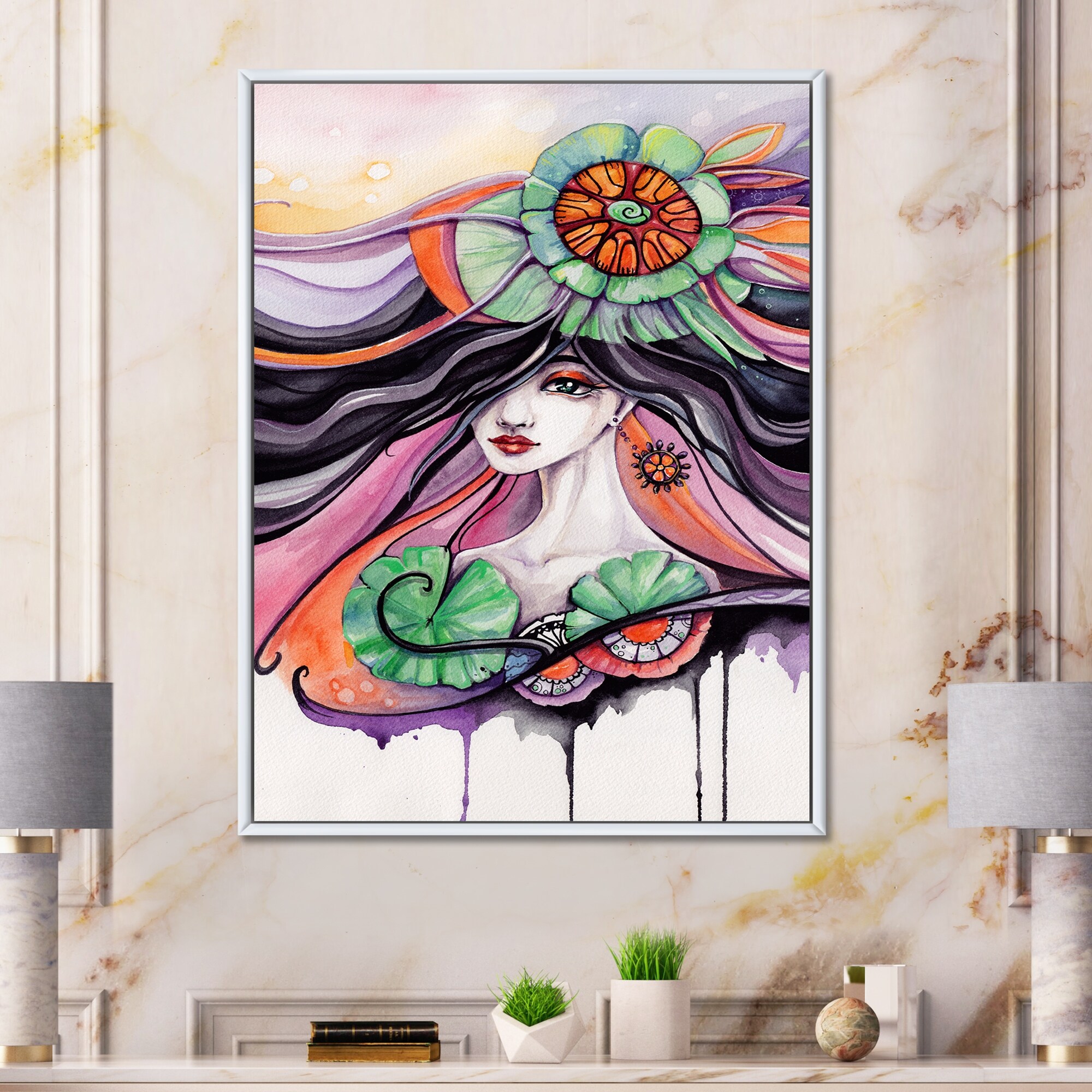 Designart "Fairy Tale Woman Face With Dark Hair And Flowers" Glam Framed Canvas Wall Art Print