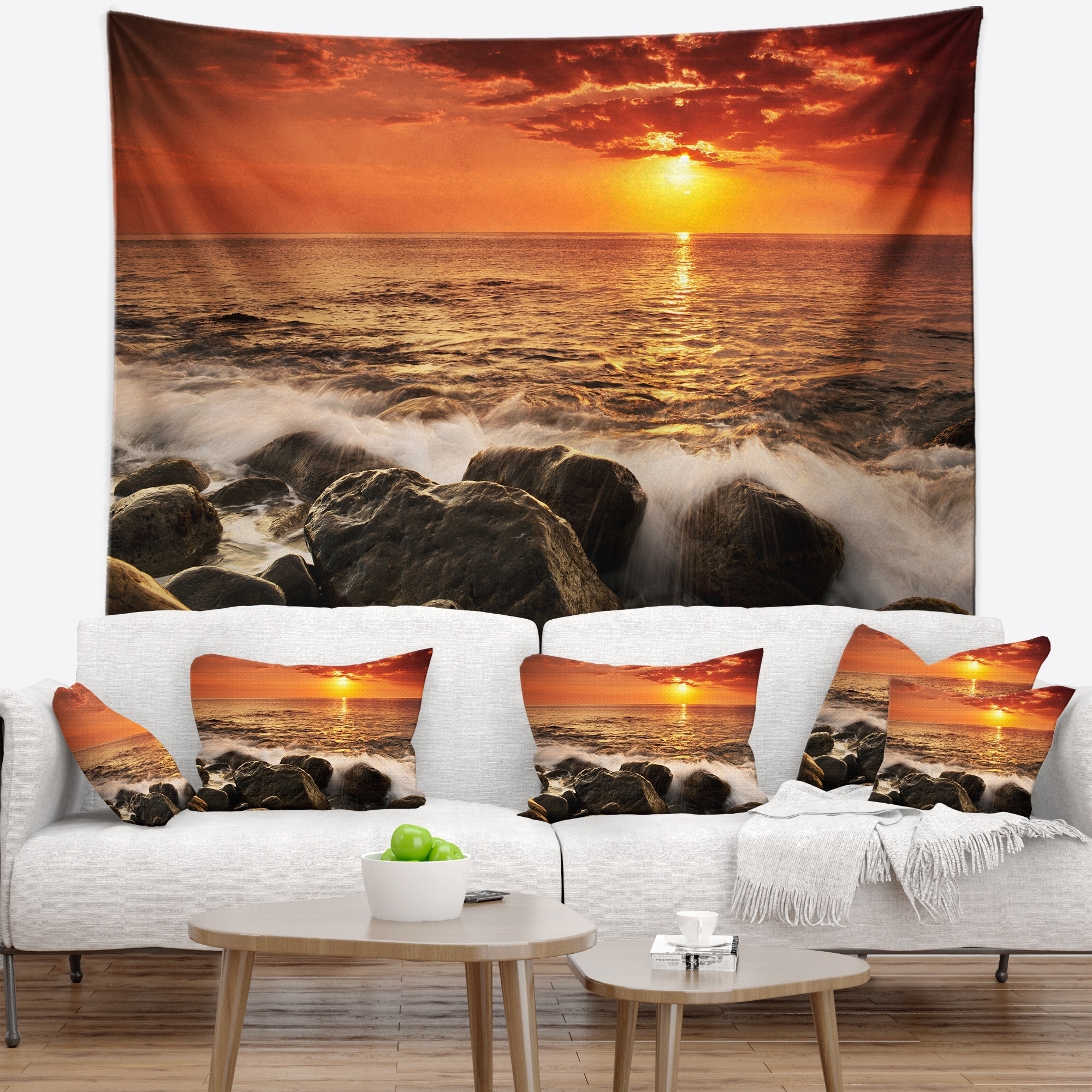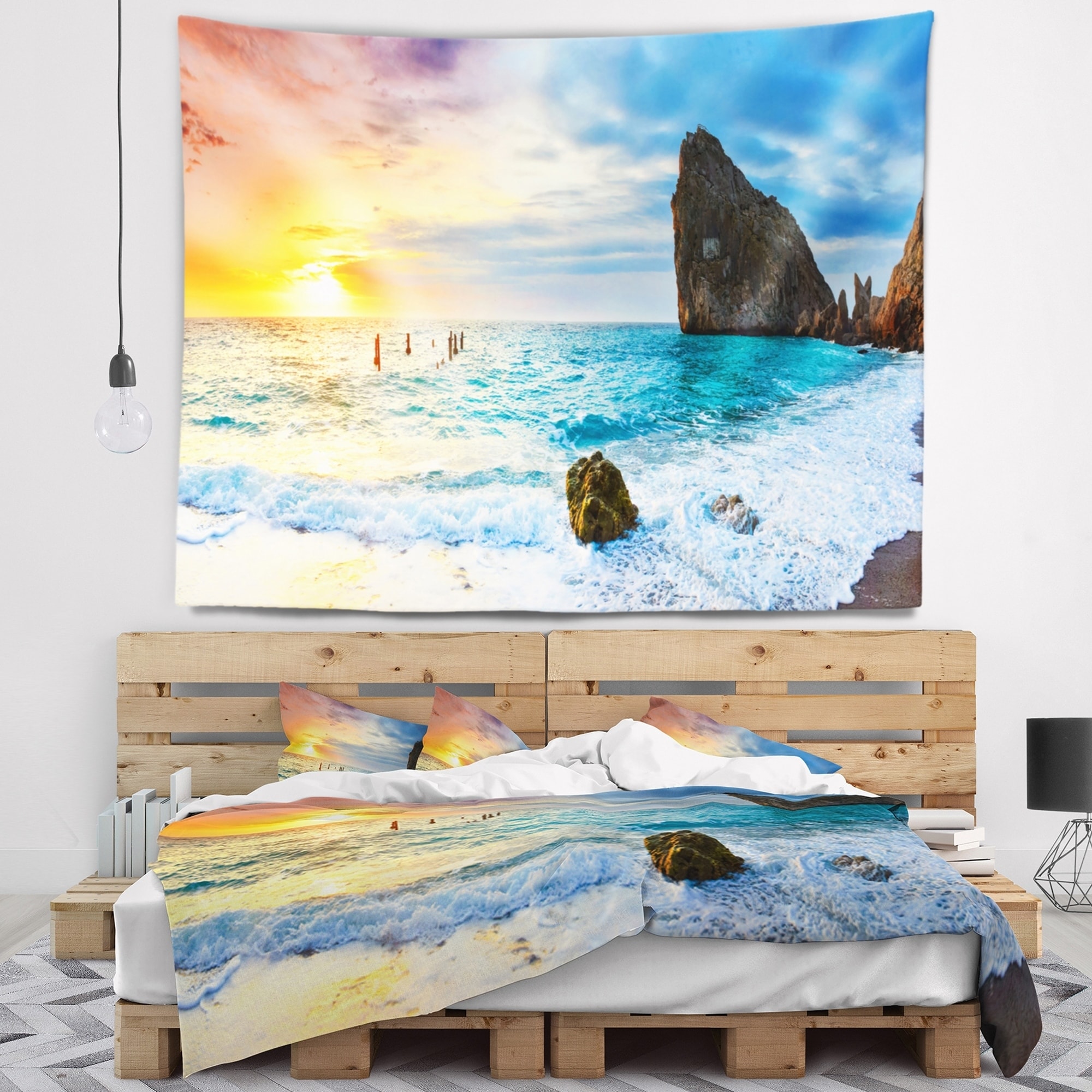 Designart 'Bright Sunset over Rocky Shore' Modern Seashore Wall Tapestry