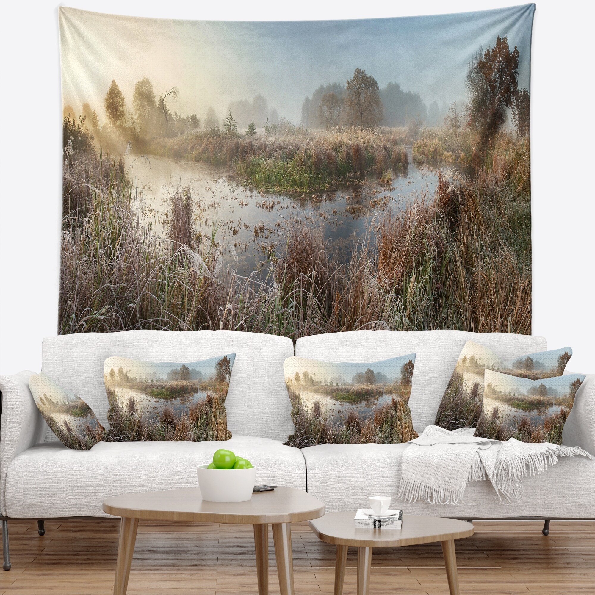 Designart 'Frosty Grass Aside River Panorama' Landscape Wall Tapestry