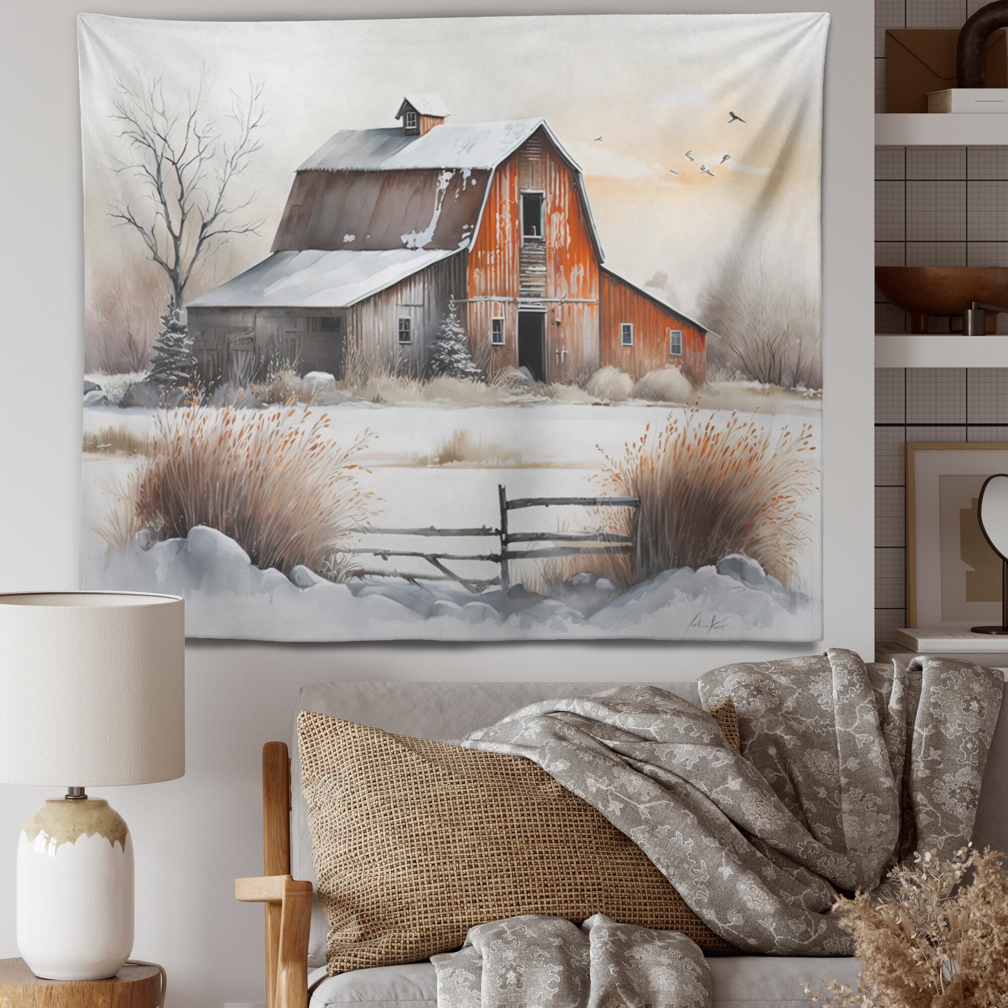 Designart 'Red Barn Scenery in Winter II' Barn Landscape Wall Tapestry