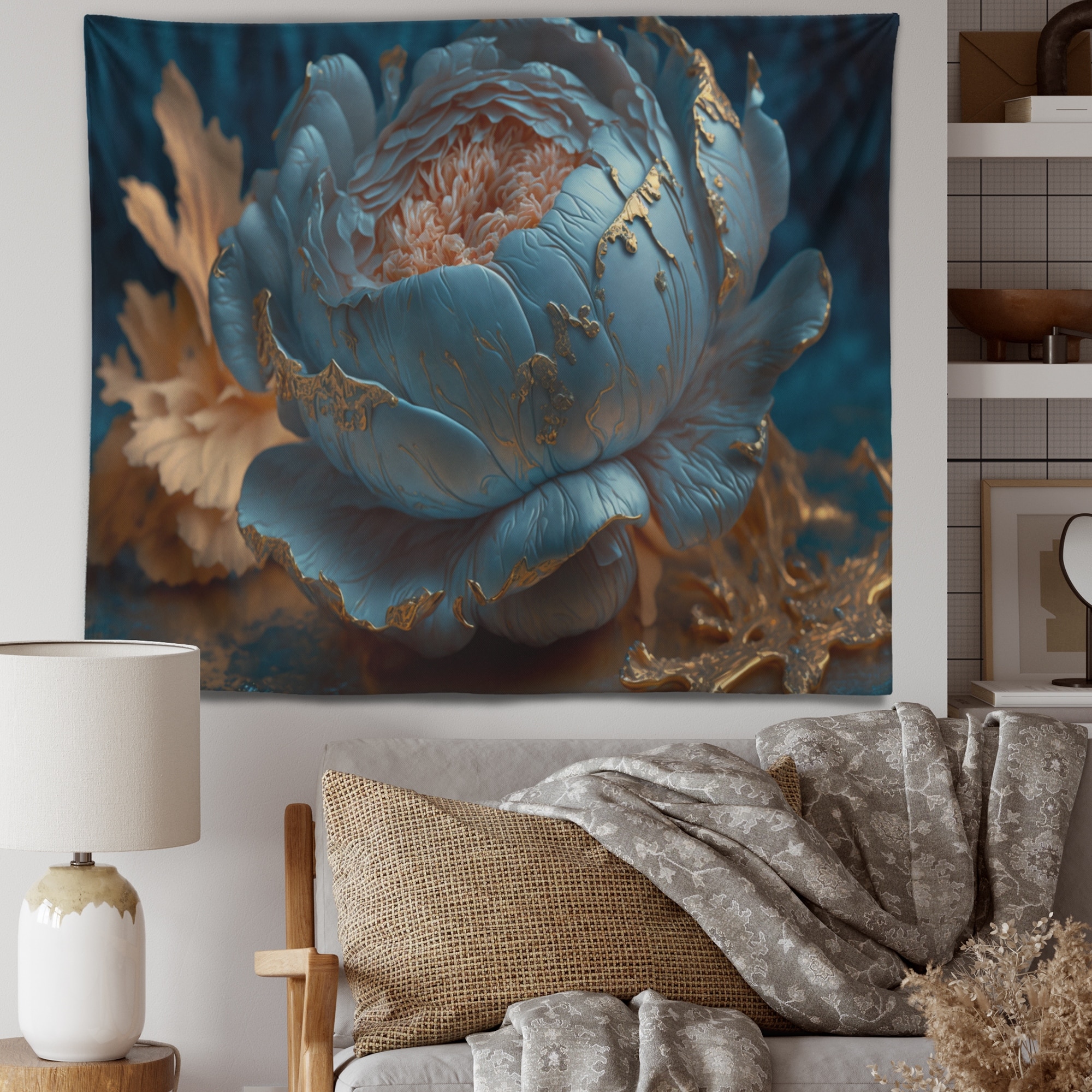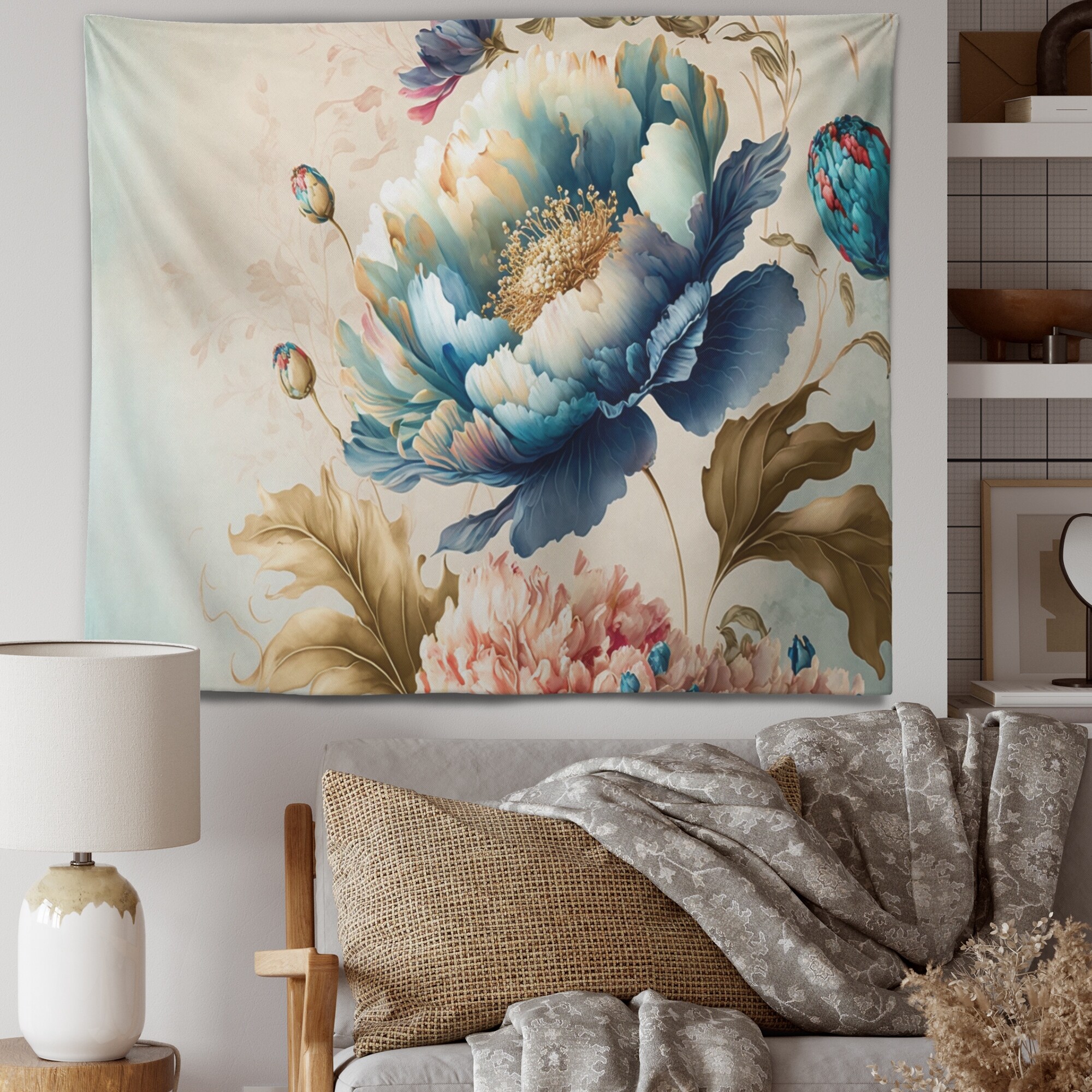Designart 'Ice Blue And Gold Peony II' Floral Peony Wall Tapestry