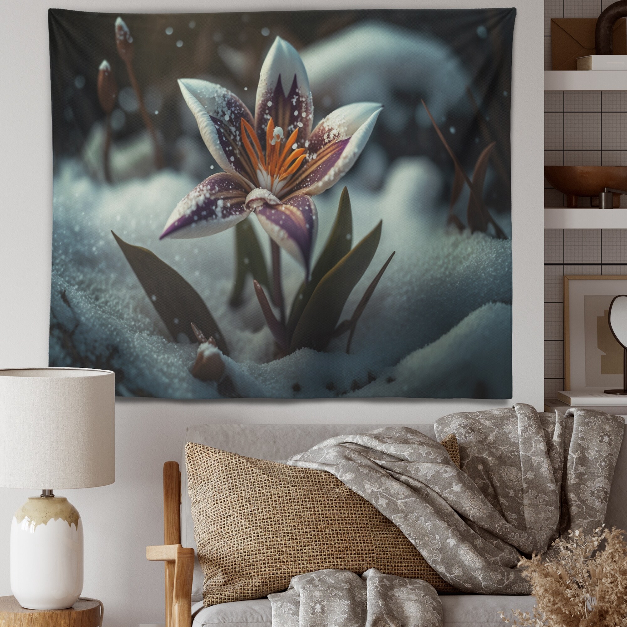 Designart 'A Blooming White And Purple Lily Flower in Winter I' Floral Sunflower Wall Tapestry