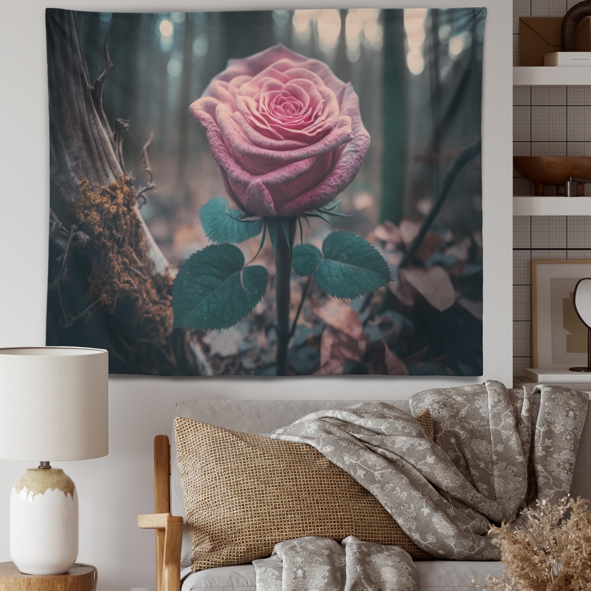 Designart 'A Blooming Pink Roses in Winter ' Floral Rose Wall Tapestry