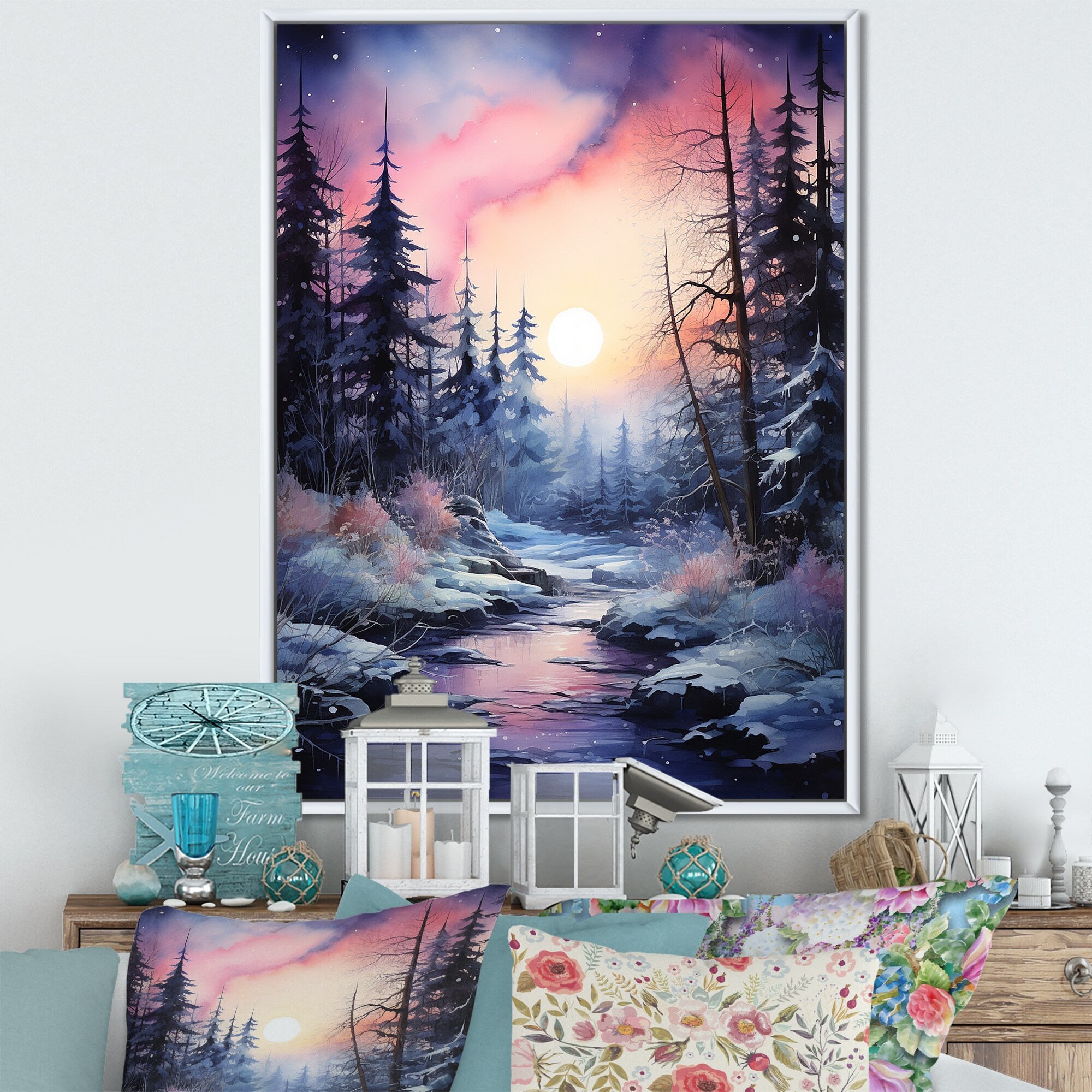 Designart "White Fushia Winter Twilight I" Winter Landscape Framed Wall Art Living Room
