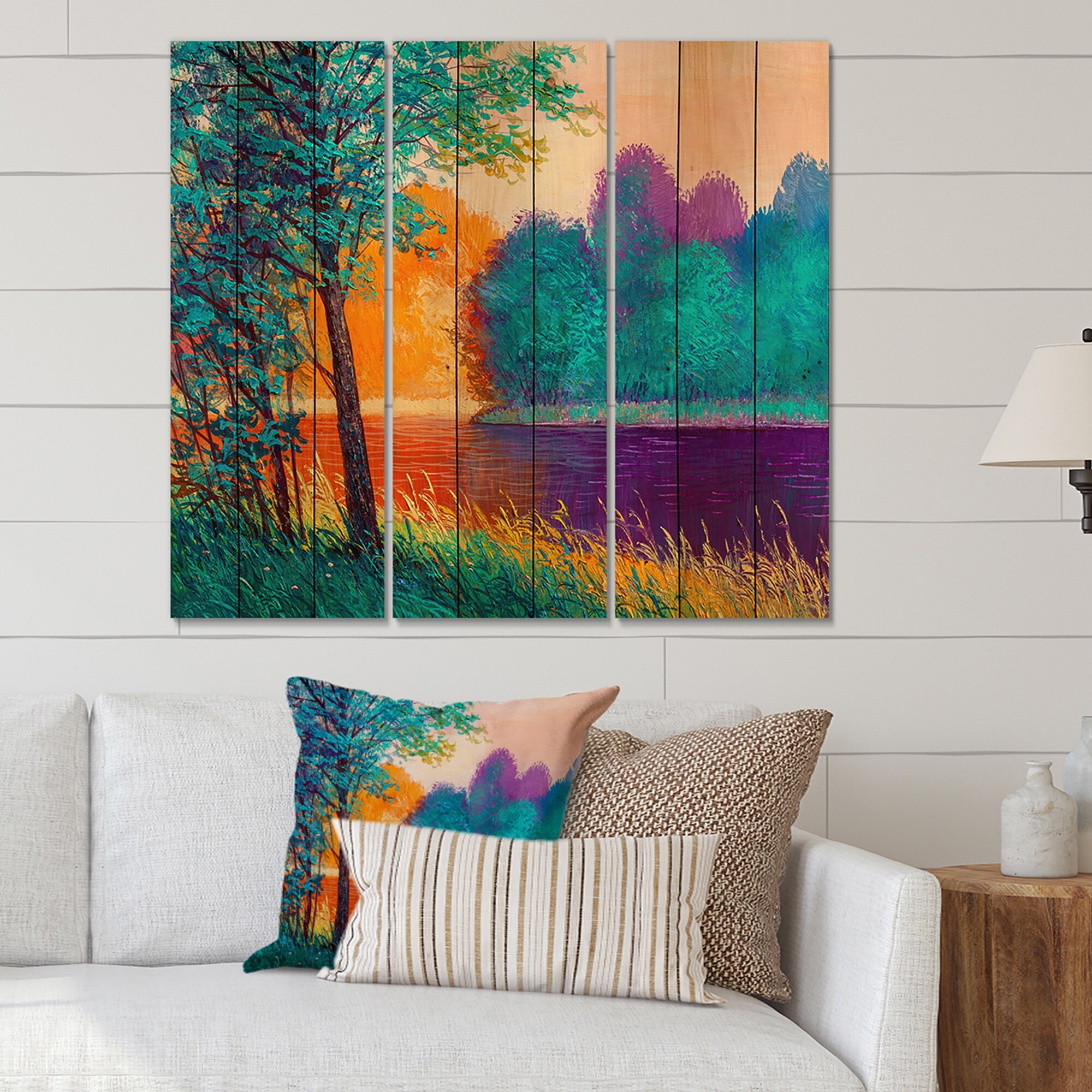 Designart 'Colorful River Between the Trees During Twilight' Traditional Print on Natural Pine Wood - 3 Panels