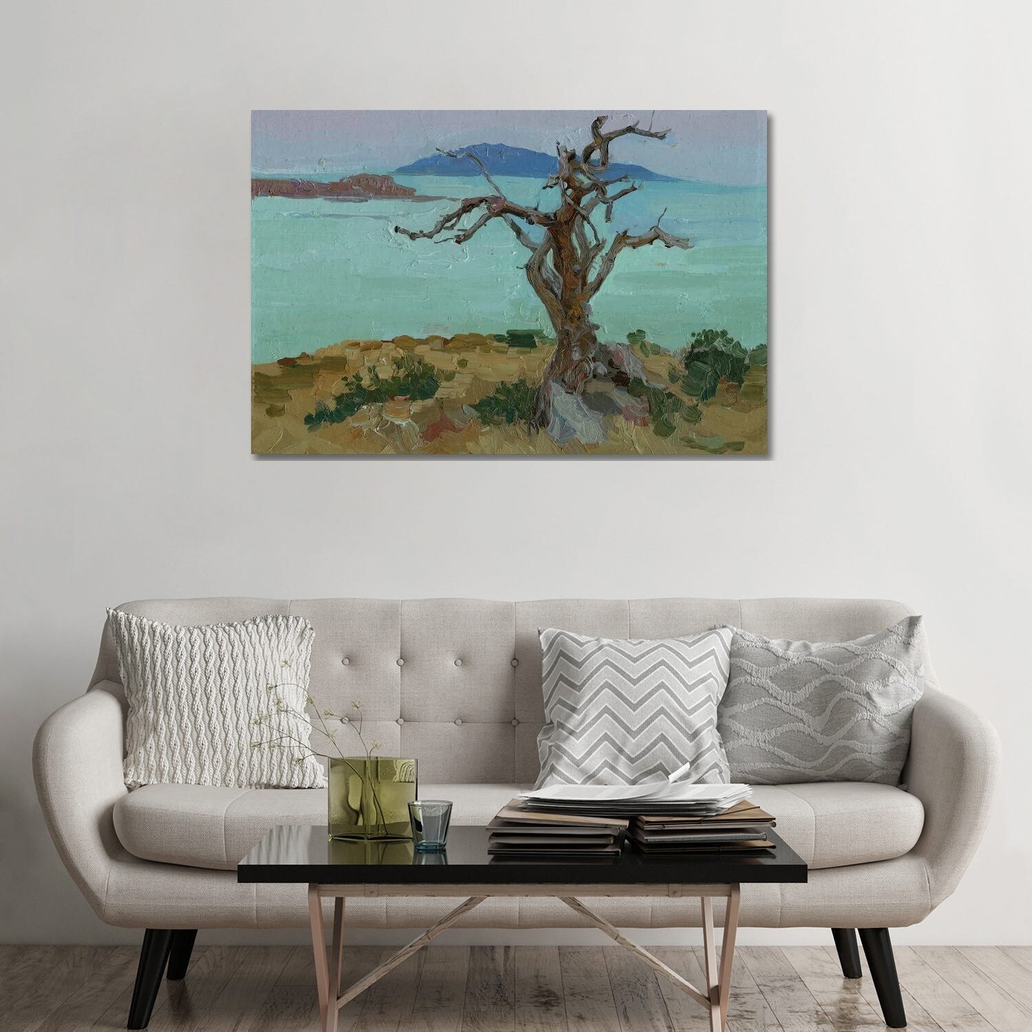 Designart "Wood Branch on Beach at Twilight" Modern Seascape Framed Canvas Artwork Print