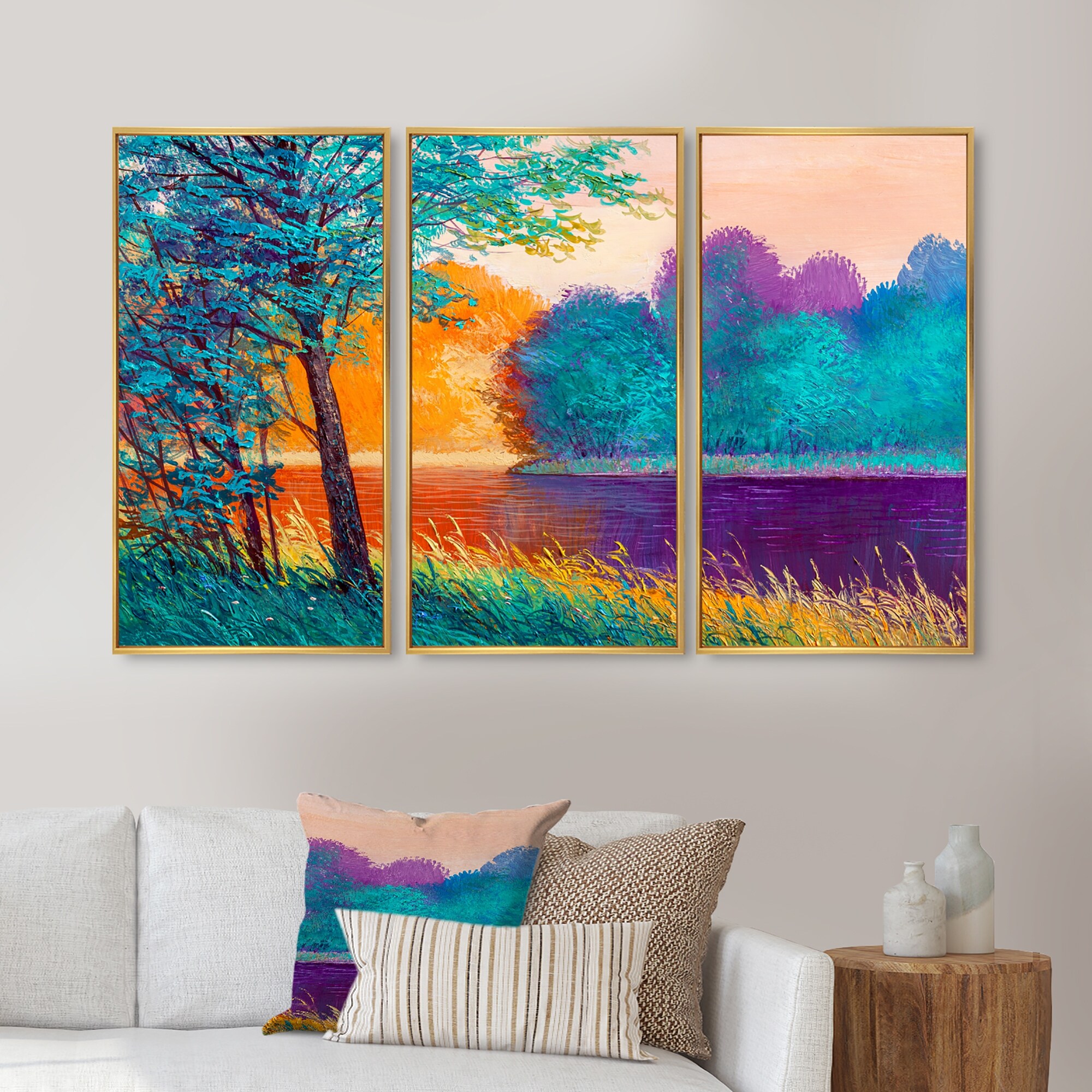 Designart "Colorful River Between the Trees During Twilight" Traditional Framed Art Prints Set of 3 - 4 Colors of Frames