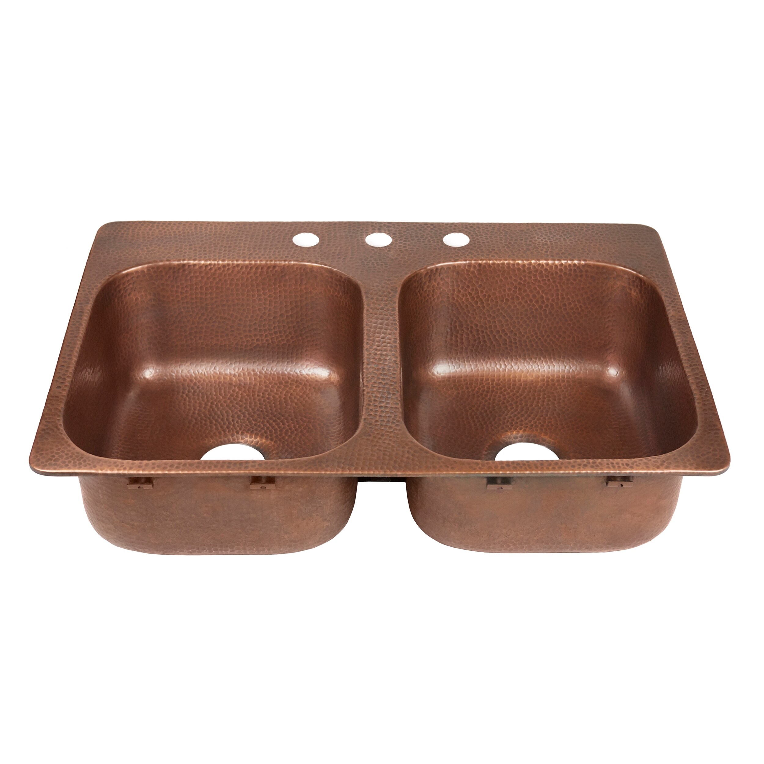 Angelico Copper 33" Double Bowl Drop-In Kitchen Sink with 3 Holes