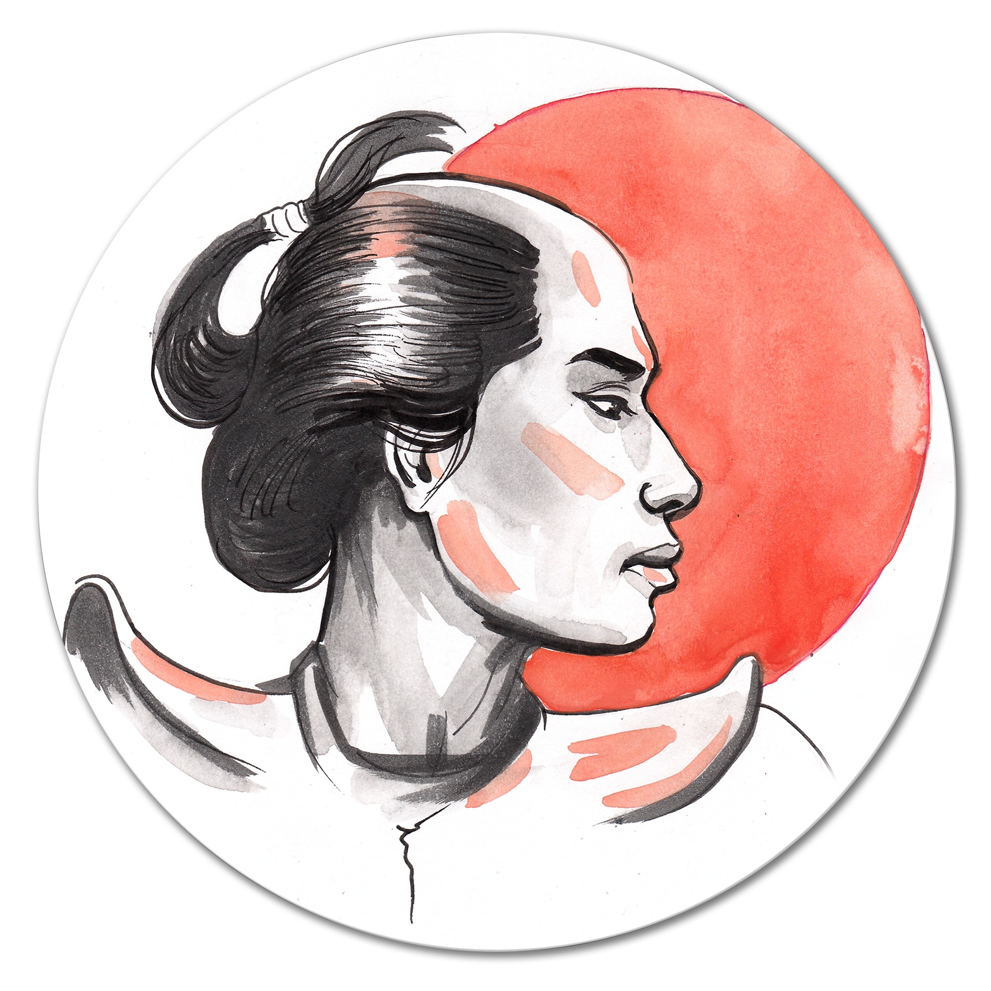 Designart 'Samurai Warrior And Red Sun' Mid-Century Modern Metal Circle Wall Art