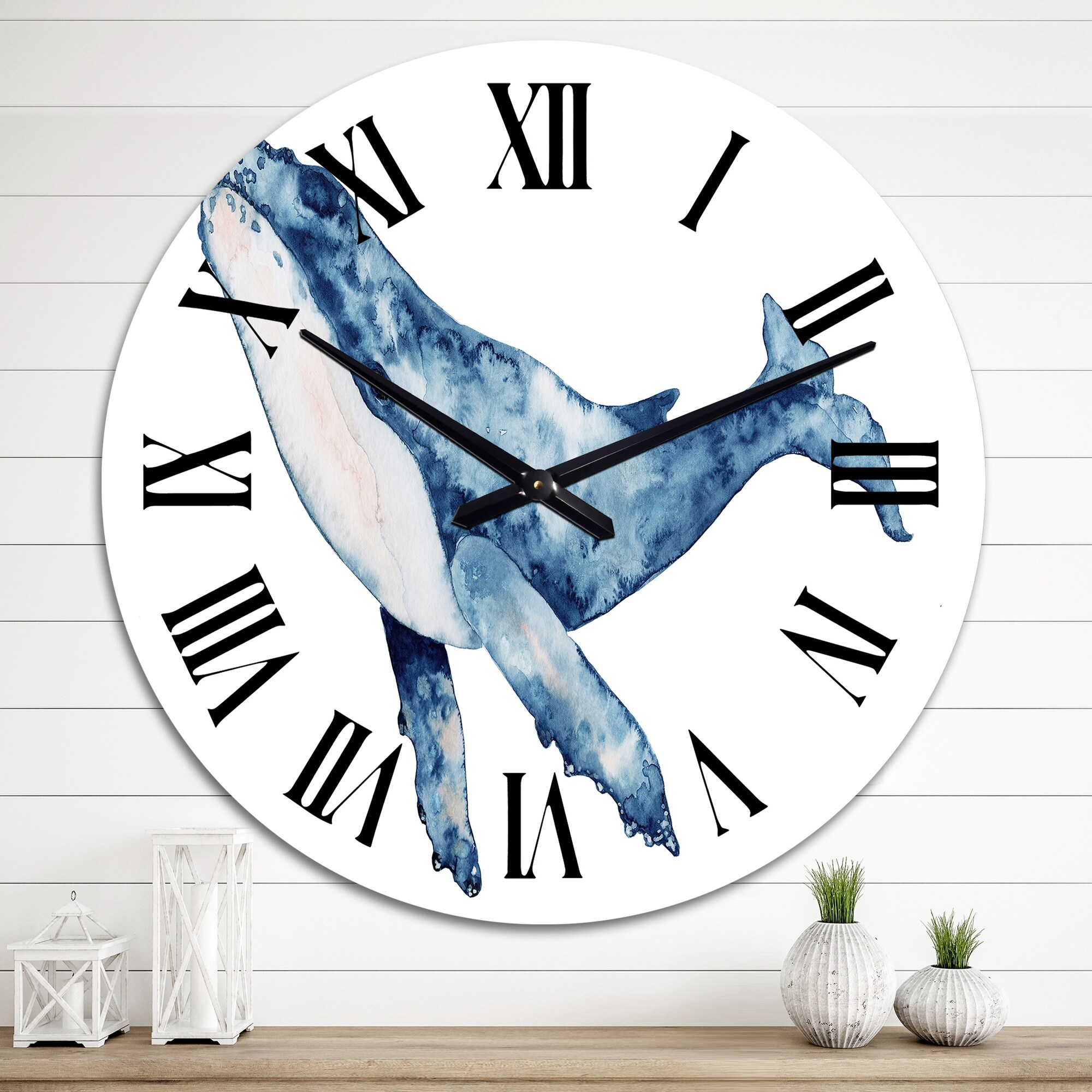 Designart 'Blue Whales Watercolor Illustration on White' Nautical & Coastal wall clock